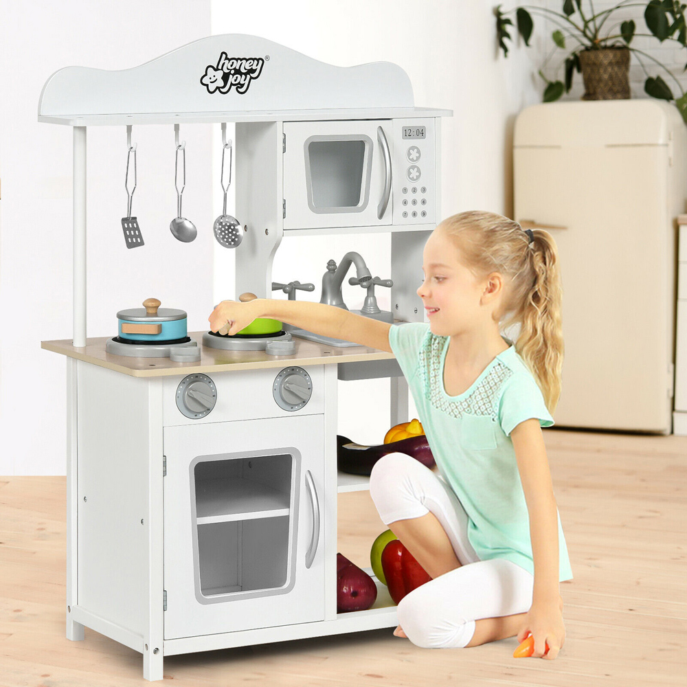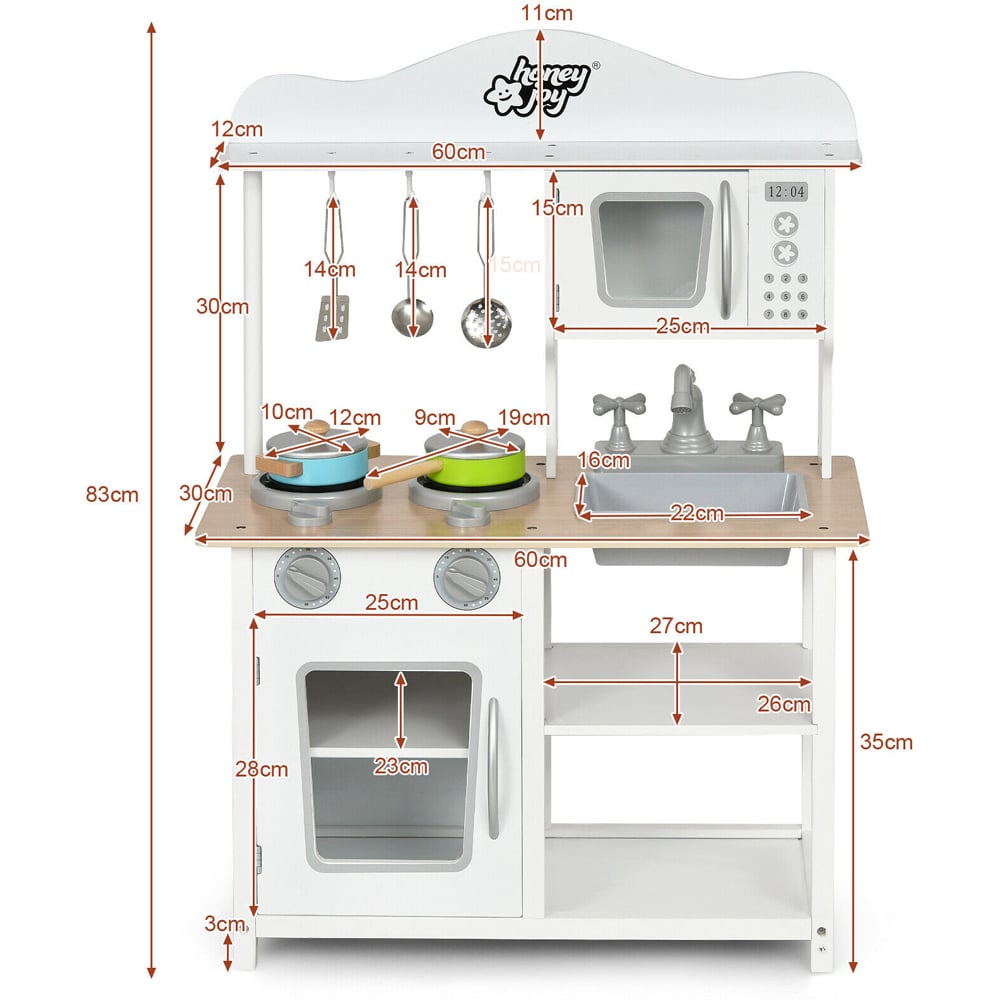 Ignite your child's culinary creativity with this Costway Kids Wooden Kitchen Playset with Cooking Pots and Utensils. Crafted from premium MDF, this kitchen playset is not only stable and durable but also safe for little ones, thanks to its smooth, rounded edges and non-toxic finishes. It features a realistic hob with clicking knobs, a microwave, an oven with two shelves, and a sink with rotating taps, providing a truly engaging play experience. The set also includes a variety of cooking accessories, making it the perfect gift to inspire imaginative play and introduce your child to the joys of cooking.