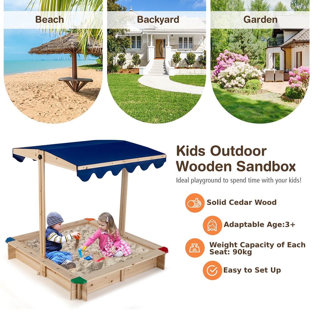 Give your child hours of outdoor fun with this Costway Kids Wooden Sandbox with Protective Corners. This wooden sandbox features a height-adjustable and tilting canopy for sun protection. The spacious sandbox offers plenty of room for digging and building, while the cedar wood construction ensures durability. It is ideal for promoting imaginative play in a safe environment.