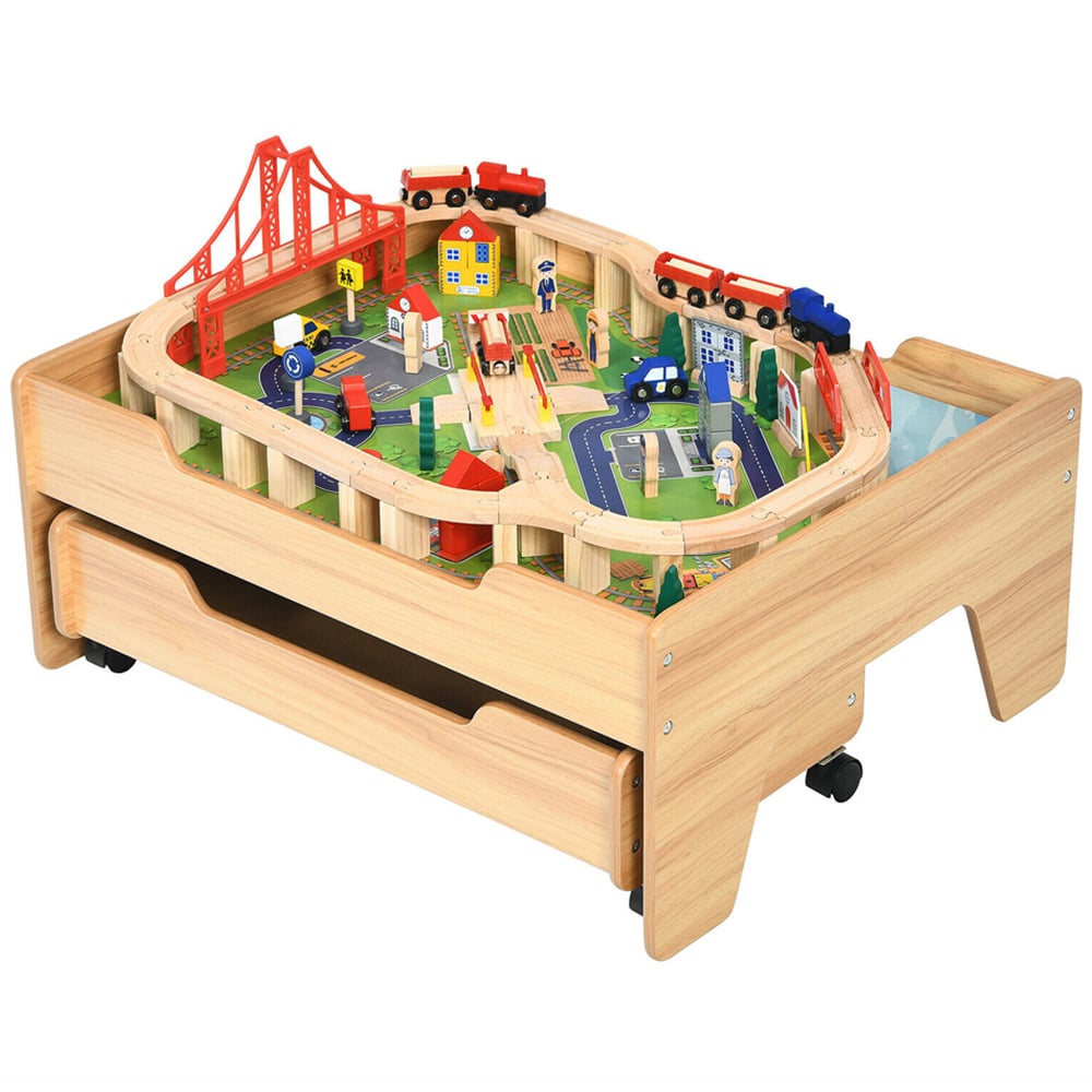 Ignite your child's imagination with the vibrant Costway Kids Wooden Train Railway Track Set Table 100 Piece. It is a perfect blend of fun and education. This delightful set features a multitude of colourful accessories that encourage creative building and cooperative play. Standing at just the right height for little ones, this durable table is designed for years of entertainment. The integrated storage drawer keeps the play area tidy by housing all the tiny parts, ensuring nothing gets lost. With its non-toxic materials and smooth, safe design, this train set table not only meets but exceeds safety standards, making it an ideal gift for birthdays or any special occasion.