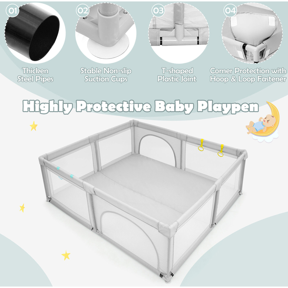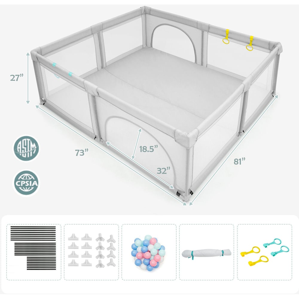 Get ready for endless fun with your child with the Costway Light Grey Kids Playpen. With the dimensions of 206 x 186 x 68cm. this large baby playpen provides your little one with a fun and safe play area. Children can freely crawl, sit and walk in it. Besides, it is equipped with four handlebars that help to assist children to learn to stand. Made of wear-resistant and tear-resistant oxford fabric, this play yard is breathable and safe to use. To better protect the child’s safety, this playpen is completely wrapped in soft cloth with no exposed gaps. Besides, with non-slip suction cups, it’s not easy to tip over after assembly. The four walls of this playpen are all breathable and visible mesh, enabling you to see your children and interact with them from any direction. On the other hand, dual doors with external zippers allow your baby to get in and out. With the help of a play yard, parents don't need to look after their babies all the time and they will have more time to do their own business. At the same time, children can develop their awareness of independence at an early date or play with friends and are surrounded by 50 colourful ocean balls for extra fun. Given its simple structure, you can assemble and disassemble this playpen easily and quickly. The package comes with clear instructions and all needed accessories which also simplify your assembly process. In addition, waterproof material makes it easy to clean.