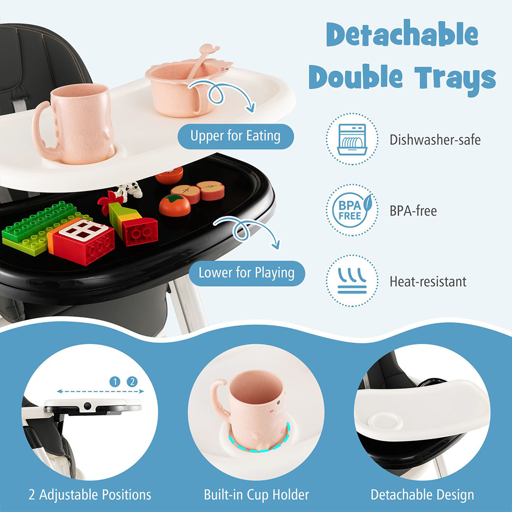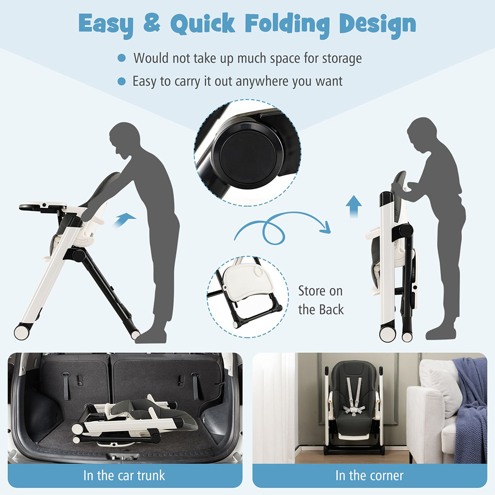 Get your child the perfect chair with the Costway Light Grey Multifunctional Folding Baby Highchair. This 5-in-1 multifunctional high chair is the ideal solution for mealtimes and more. The 7-level adjustable height feature enables you to find the perfect position for a comfortable feeding experience. The 5-level reclining backrest provides extra support and relaxation options for your little one. Additionally, the 3-angle adjustable and 3-length retractable footrest can accommodate growing legs, ensuring optimal comfort during meals. The chair is crafted from high-quality materials with a sturdy structure, ensuring your little one is safe and secure during mealtimes. When not in use, its folding design makes it convenient to store and transport, while the wheels allow for easy movement from one room to another. The two lockable rear wheels also provide added security. Whether it's mealtime, playtime, or naptime, our multifunctional high chair is the perfect companion for your growing child. Witness their thriving independence as they enjoy mealtime in style and comfort.