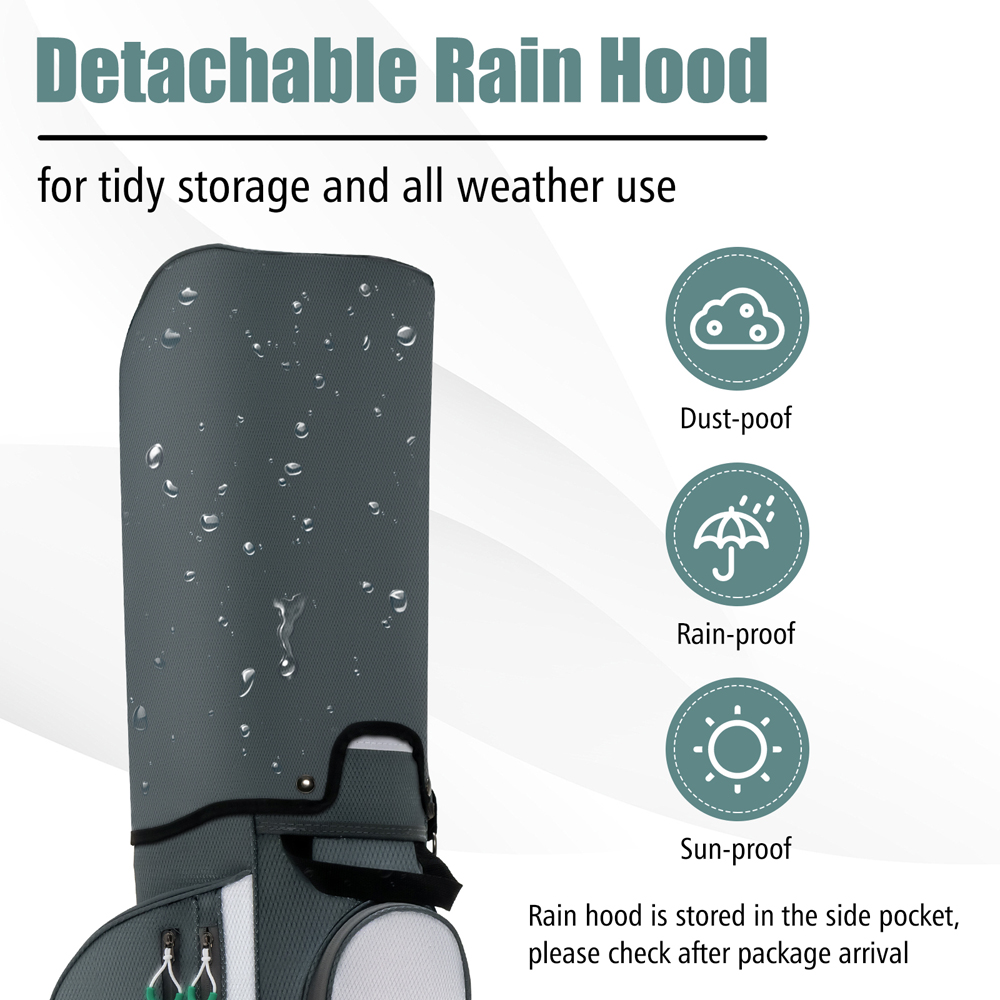 Play golf with easy and instant access to the club of your choice with the Costway Lightweight Golf Bag with 14 Dividers and 7 Pockets. This lightweight 1.7kg bag is made of premium nylon material with a water-resistant design for durability and longevity. The package includes a rain hood which can be used as a dust cover for tidy and safe storage during transport. It features 14 independent dividers with decent space for your clubs and protects them from scratching against each other. The seven zippered pockets including a valuable pocket and a cooler bag offer ample storage space for your belongings. Every pocket is front facing to enable easier access when placed on a trolley. The umbrella holder and gloves fastener can free your hands while you are playing. This golf bag has a wide and thick shoulder strap with a portable handle for your convenience. The base features six anti-slip pads for stability and support while playing.