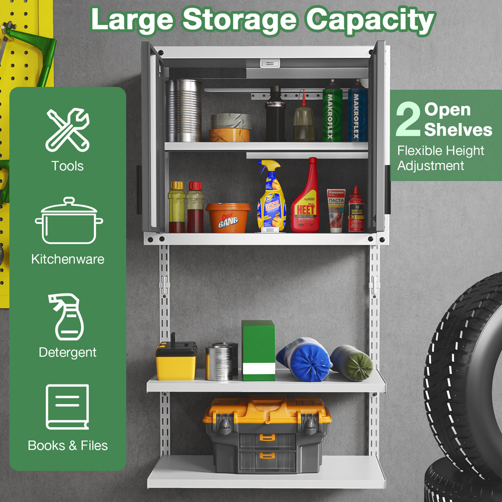 Keep your essentials organised and secure with the Costway Metal Lockable Wall Cabinet, featuring lockable doors and versatile adjustable shelving. This robust unit, crafted from heavy-duty metal with a sleek powder-coat finish, promises durability and a significant load capacity of up to 25kg per shelf. Ideal for spaces ranging from garages to kitchens, it maximises vertical space by hanging neatly on your wall, ensuring a tidy and uncluttered environment. With its minimalist design and majestic storage capabilities, it's the perfect solution for safeguarding everything from large tools to small trinkets.