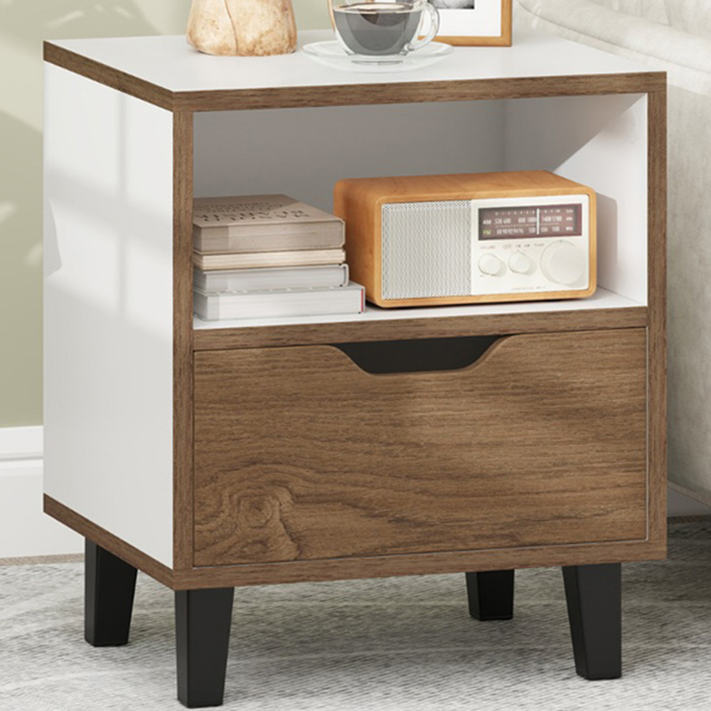Blending elegant wood grains with sleek panels, this Costway Mid Century White Nightstand Set of 2 adds a sophisticated modern touch to any living space. Enjoy the practicality of an open shelf for easy access to your tablet or current book, while its top is ideal for placing a lamp to set the mood. The drawer smoothly glides open, providing a convenient storage spot for personal belongings like undergarments and beauty products. With its sturdy metal legs, non-slip foot pads, and low-maintenance surface, this bedside table is a long-lasting companion in your home! nightstand features a unique colour-blocking design of wood grains and creamy white panels. A perfect blend of rural charm and modern lifestyle, it is a statement piece that easily meets any home styling trends. With a spacious tabletop, an open shelf, and a deep drawer, this bedside table offers ample storage options. You can easily access your belongings from the top and open shelf, while using the drawer for privacy and secure storage. The bedroom side table is reinforced with sturdy metal legs and back panel buckles, ensuring it remains steadfast for years of use. Plus, all four legs are equipped with anti-slip foot pads to protect your floor from scratches. Designed for ease of use, the drawer of the end table features a cut-out handle and smooth metal slide rails for effortless operation. The sleek surface is easy to clean, keeping it looking fresh with minimal effort. Measuring 37 x 33 x 44 cm (L x W x H), this nightstand fits neatly into compact spaces. Beyond bedrooms, it also functions as a stylish side table in living rooms, complementing your sofa and chairs.