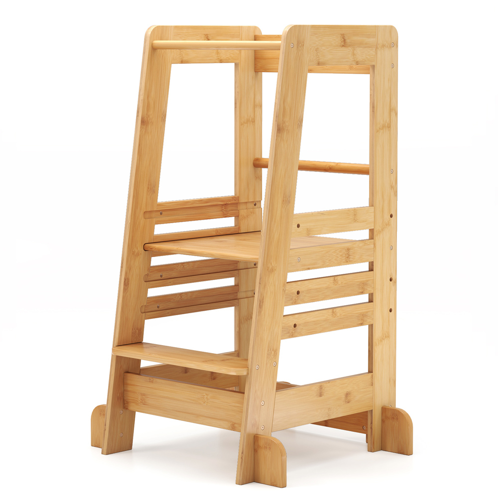This standing tower is made of premium bamboo material, which makes it much safer and more durable for long-term use. The standing platform is adjustable in 4 heights(30/37/44/51cm) as your child grows up. The stable A-shaped construction is also equipped with anti-tip feet and all-round safety rail to improve security. Parents can place the kid on this standing stool while they are busy with cooking, housework and more, which frees their hands and keeps the kid safe. And this learning tower can help children to develop independence: take things from high places, wash hands by themselves, eat with family, etc. Adjustable Standing Platform: The standing platform features 4 adjustable heights (floor to platform heights): 30cm-51cm. So, this learning tower is able to grow with your child. This kitchen stool helper promotes toddlers’ independence, learning, and creativity. Stable and Safe Structure: The A-shaped structure is designed to prevent tip-over accidents, and the anti-tip feet add extra security. What’s more, the anti-collision round corners can prevent your kids from being scratched. The large platform is surrounded by four-sided safety rail to give all-round protection. Weight capacity: 70kg. High Quality and Safe Material: Made of natural bamboo material, this environmentally friendly kitchen stool is durable, safe and odourless. The smooth surface requires easy maintenance. Certified by UKCA, parents can buy trustingly. Free Parents’ Hands and Develop Independence: You can place this standing tower by your side when you are cooking, washing dishes and more, which keeps company with your child but frees your hands. Kids can also learn skills like cooking, washing hands, brushing teeth, baking and more. Easy Installation and Wide Application: Following step-by-step instructions, this step stool is hassle-free to assemble. This multi-use step stool is a great helper in the bathroom, kitchen and more. Product dimension: 53 cm x 49 cm x 91 cm (L x W x H). Suitable age: over 18 months.