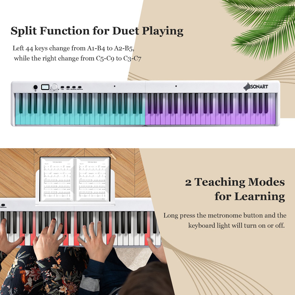 Immerse yourself in the melodic bliss of the Costway MU10090GB White 88 Key Foldable Electric Keyboard Piano. This digital piano keyboard stands out with its dual stereo speakers that deliver an impressive array of 128 tones, 128 rhythms, and 20 demos, alongside 88 keyboard percussions. With 88 full-size semi-weighted keys featuring a wood grain design, it offers an authentic piano touch with adjustable intensity response. The innovative split function facilitates duet playing, while two teaching modes with lighted keys make learning both fun and effective. Designed for on-the-go musicians, it boasts a foldable structure secured by a one-button buckle and a portable bag for easy transport. Moreover, its 1750mAh built-in battery ensures up to 12 hours of playing time, and multiple connectivity options including dual wireless connections enhance its versatility.