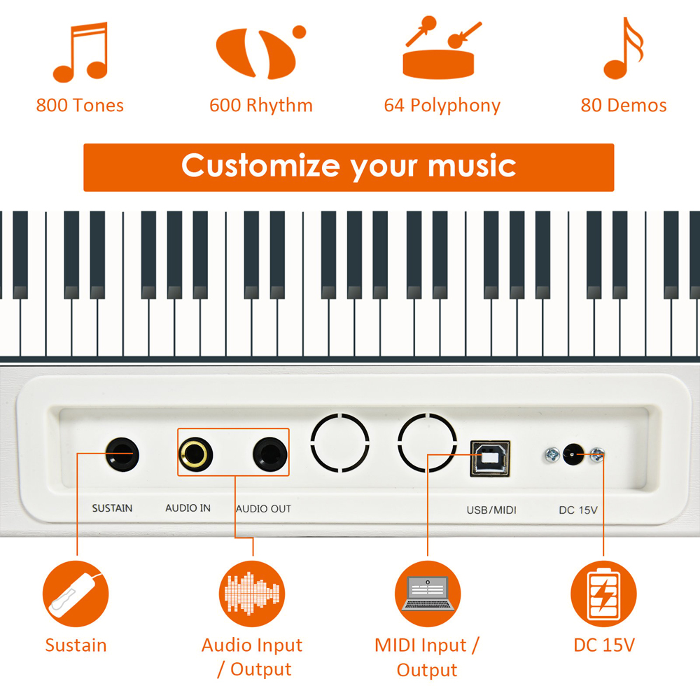 Immerse yourself in the melodious world of music with the Costway MU70017GB White 88 Key Beginner Digital Keyboard Piano. This piece is a perfect blend of functionality and elegance for beginners and music enthusiasts alike. This digital piano boasts an impressive array of features including 88 full-size weighted keys that provide an authentic piano feel. With dual-tone modes, you can layer sounds like piano and drum, sparking creativity and offering a rich acoustic experience. The piano is equipped with an extensive selection of 800 tones, 600 rhythms, and 80 demos, making it versatile for exploring various musical styles. The multi-functional panel with a digital display and numerous control options enhances your playing experience, while the built-in speakers and professional pedal deliver high-quality sound and true-to-life pedal response. Connectivity is a breeze with MIDI/USB interfaces and Bluetooth, allowing for seamless integration with other devices for an enriched learning experience.