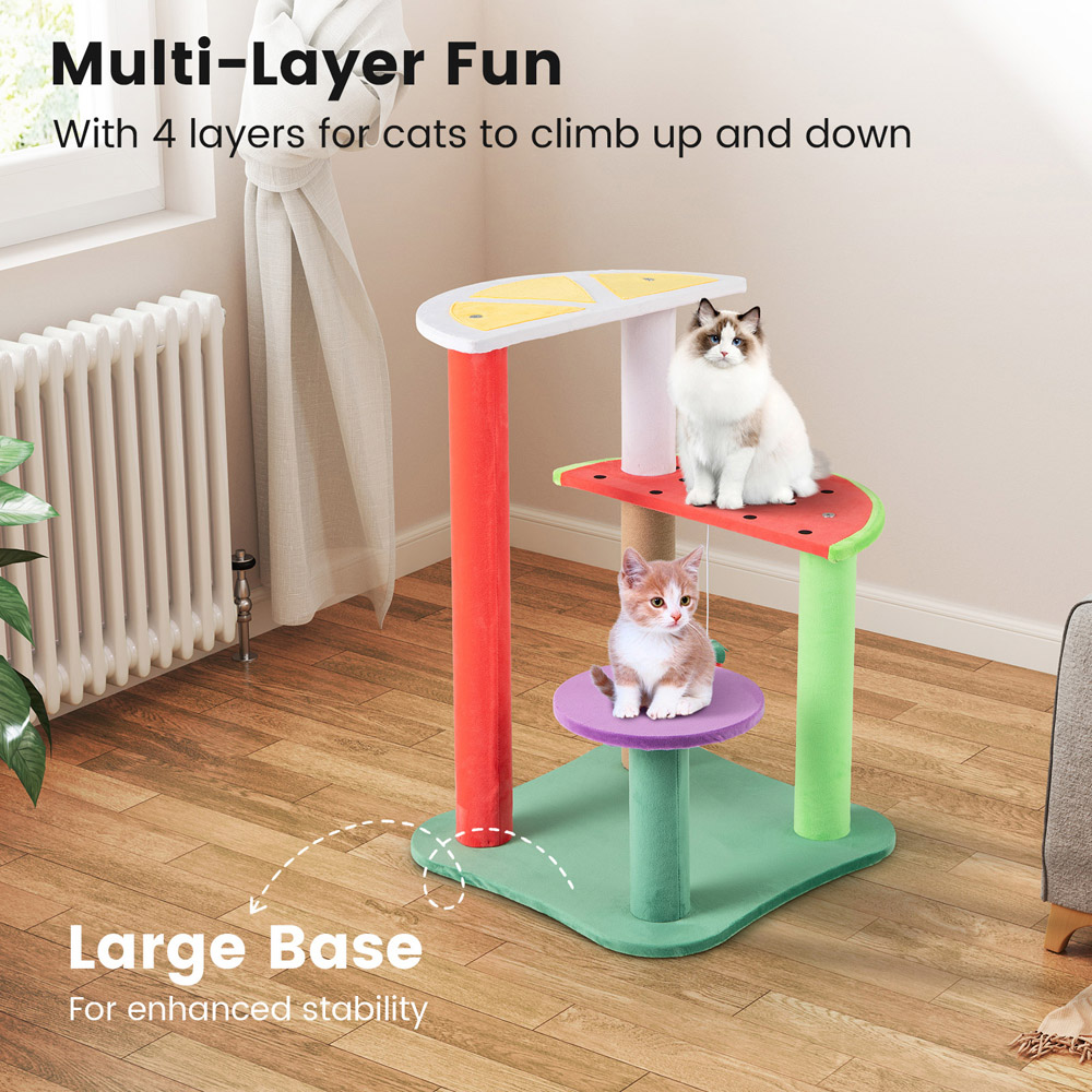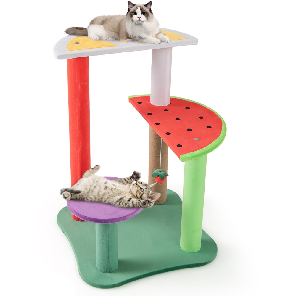 Elevate your cat's playtime and your home's aesthetic with the Multi-Level Aesthetic Fruit Cat Tower, featuring fruit-shaped platforms that blend fun and functionality. This 69cm tall cat tree offers your furry friend a variety of activities with its two semicircle platforms and a small round platform, all covered in a soft plush fabric for ultimate comfort. The playful fruit-themed design includes lemon, watermelon, and grape-shaped platforms, complete with vivid strawberry balls, making it a delightful addition to any living space. It's not just visually appealing but also packed with features like a plush dangling ball and a fully-wrapped scratching post to keep your cat entertained and active. The stable structure ensures safety while the easy assembly makes it perfect for small spaces.