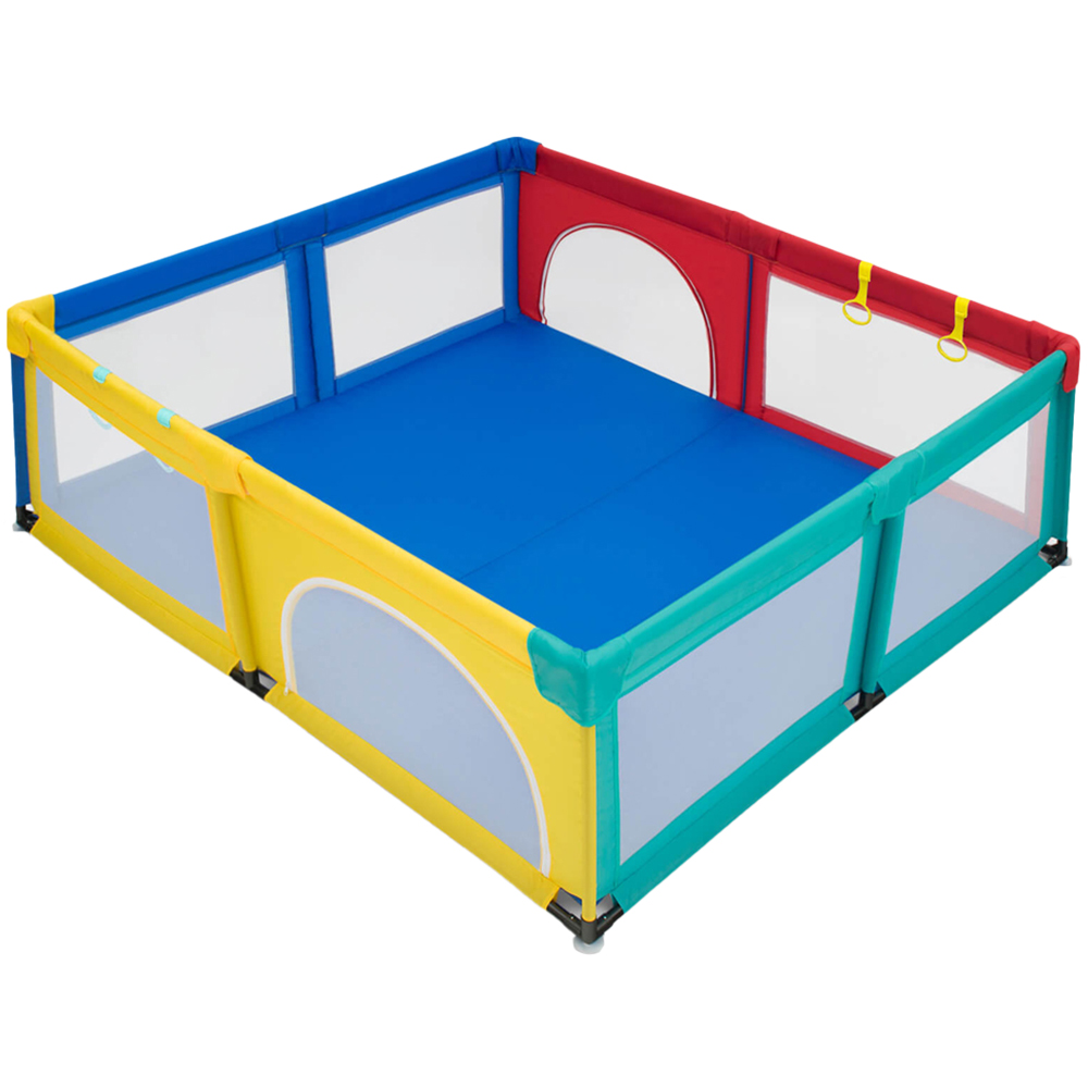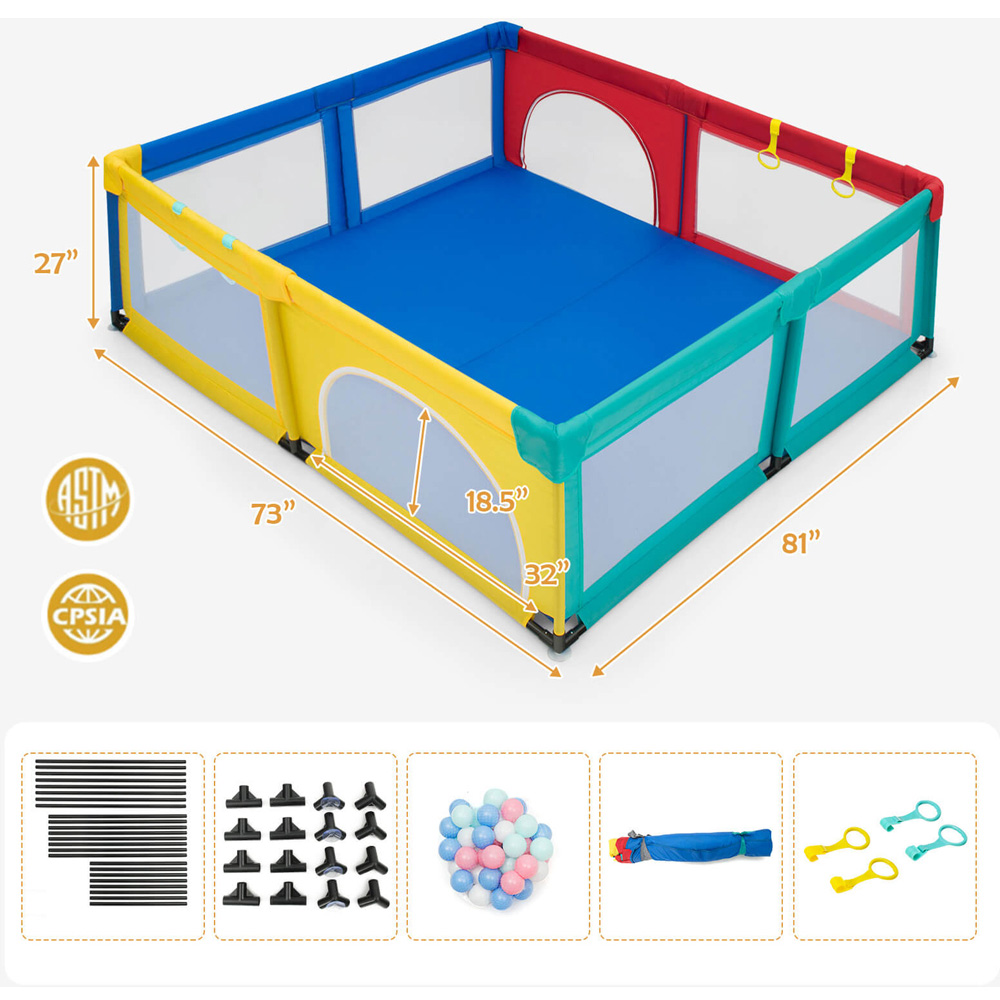 Get ready for endless fun with your child with the Costway Multicolour Kids Playpen. With the dimensions of 206 x 186 x 68cm. this large baby playpen provides your little one with a fun and safe play area. Children can freely crawl, sit and walk in it. Besides, it is equipped with four handlebars that help to assist children to learn to stand. Made of wear-resistant and tear-resistant oxford fabric, this play yard is breathable and safe to use. To better protect the child’s safety, this playpen is completely wrapped in soft cloth with no exposed gaps. Besides, with non-slip suction cups, it’s not easy to tip over after assembly. The four walls of this playpen are all breathable and visible mesh, enabling you to see your children and interact with them from any direction. On the other hand, dual doors with external zippers allow your baby to get in and out. With the help of a play yard, parents don't need to look after their babies all the time and they will have more time to do their own business. At the same time, children can develop their awareness of independence at an early date or play with friends and are surrounded by 50 colourful ocean balls for extra fun. Given its simple structure, you can assemble and disassemble this playpen easily and quickly. The package comes with clear instructions and all needed accessories which also simplify your assembly process. In addition, waterproof material makes it easy to clean.