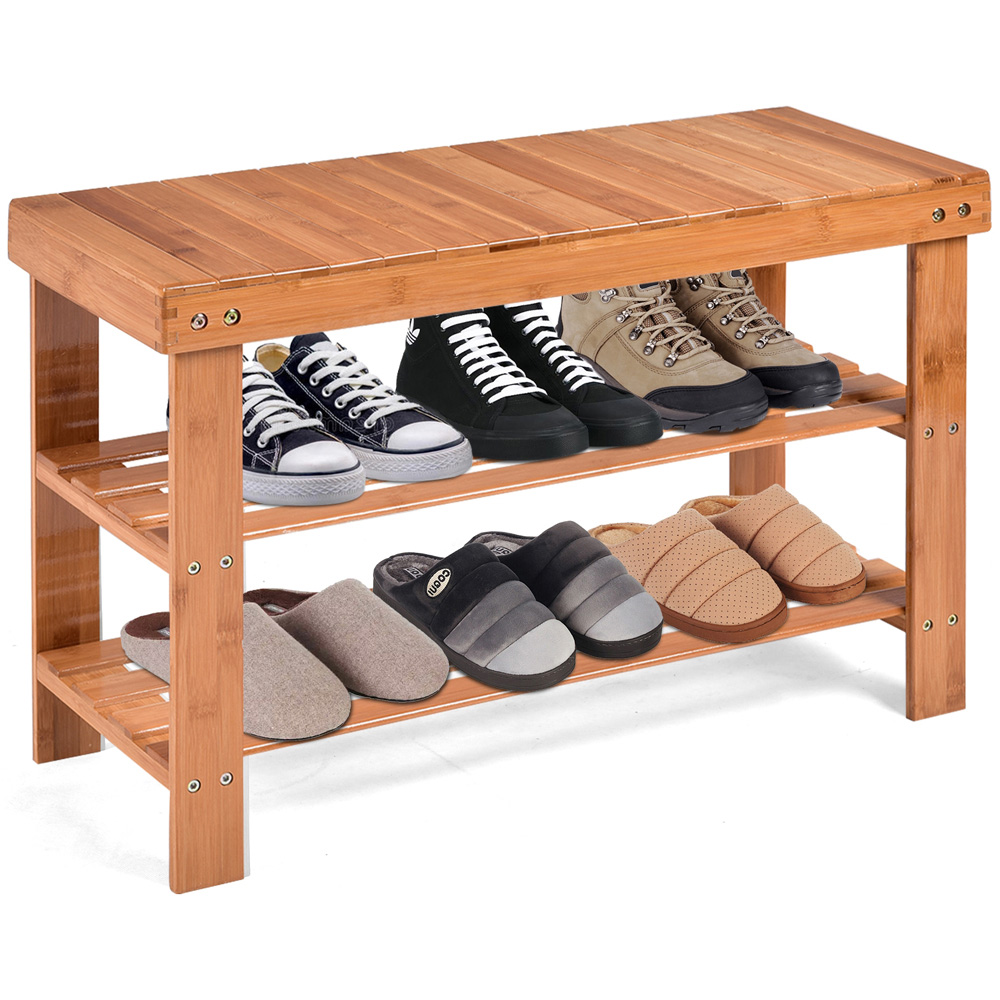 Make a sturdy and practical addition to your home decor with the Costway Natural Bamboo Shoe Bench. It is made from bamboo material with a lacquered finish for durability and longevity. It features smooth seating with two open shelves with a slatted design. This shoe rack bench will be the perfect storage solution for your entryway, ensuring quick and easy access to your shoes. Each shelf holds up to three to four pairs of shoes, with a total load-bearing capacity of 100kg. It be used as a shoe bench, bedside table, plant stand or side table. This stylish natural bamboo rack can match any style of home decor. It is suitable for your hallway, entryway, living room, bedroom or children’s room. It comes with clear and detailed installation instructions for easy assembly.