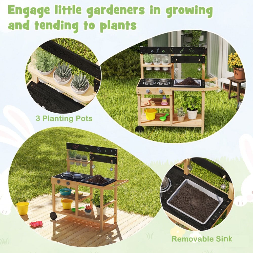 Crafted with sturdy fir wood, this outdoor kitchen playset is a secure and dependable option for children over three years old. The child-friendly handle and smooth wheels make it a breeze to move the kitchen. Kids will delight in playing with stoves, rotary knobs, and sink. With three planting pots included, little ones can also engage in gardening activities. The chalkboard adds creative fun to the play experience, encouraging imagination and artistic expression. Additionally, the hooks and open shelves provide convenient storage and easy access to play items.