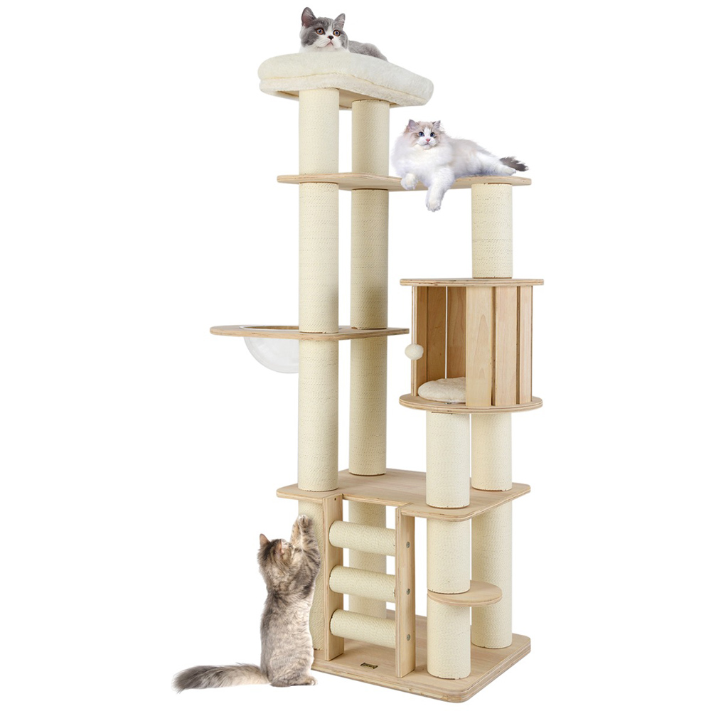 Elevate your feline's playtime and comfort with the 180cm Tall Cat Tree, expertly designed to cater to all your cat's climbing, scratching, and lounging needs. This multi-layered tower, standing impressively tall, offers a sturdy and stable environment with its thickened 12cm supporting posts and a 3cm reinforced base, ensuring it remains wobble-free even as your cat leaps and lounges. Featuring a variety of resting spots including a cosy top perch, a breathable cat condo, and a unique transparent space capsule, this cat tree is perfect for cats who love to explore different heights and spaces. The addition of a plush dangling ball, a three-step ladder with rope wrapping, and several scratching posts enriches your cat's playtime and encourages their natural clawing behaviour. For added convenience, it comes with removable and machine-washable cushions, making cleaning a breeze and keeping the environment fresh and inviting for your pet.