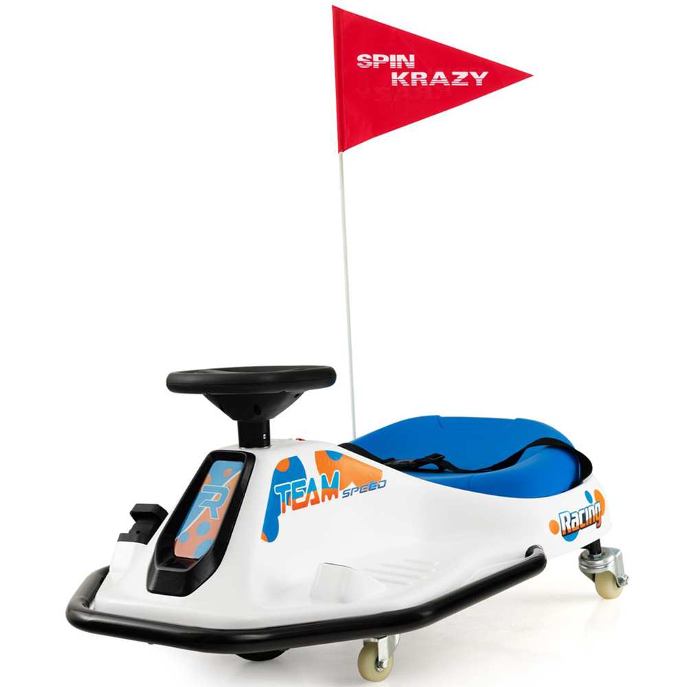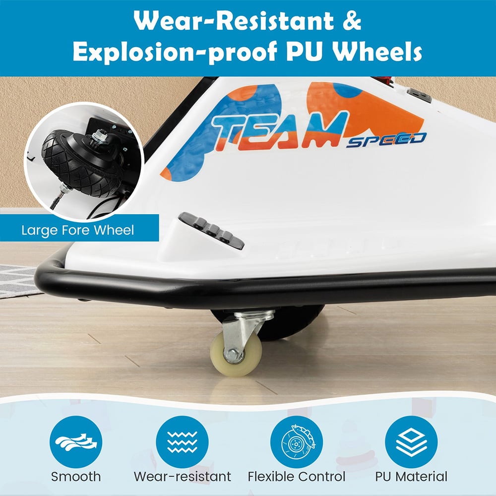 Watch your little one play around in style with Costway Navy Kids Drifting Electric Go Kart. With 4 PU universal wheels and 1 rubber drive wheel, your little racer over 3 years old can pull off impressive drifts. The 24V battery and motor enable kids to enjoy a driving speed ranging from 3 to 8 kph. The LED headlight, wireless connection, radio, USB option, and music will also help your little one to have unforgettable memories. It is also designed with 3 flags. To ensure driving safety for your child, it is equipped with a slow start and slow stop function and an adjustable safety belt. It has 5 wear-resistant and silent wheels for kids to smoothly drive on cement roads, brick roads, wood floors, or asphalt roads. It also features a design keeping kids in mind, such as the protective poles and decorative stickers. This 24V kids' ride-on-drift car features 4 flexible universal wheels and 1 large drive wheel for a 360-degree spin. Your little racer can freely change direction and achieve acceleration through the steering wheel and foot pedal. It has 2 speed options (high or low) for kids. The foot pedal is designed with a safe slow start and slow stop function to avoid the risk of sudden acceleration or emergency braking. The wide seat with a safety belt keeps your little one secure and the seat supports up to 60 kg with protective metal poles to provide added safety. The LED headlight, wireless connection, radio and music will enhance the enjoyment of your child’s adventures. The USB port can connect electronic devices to play kids’ favourite songs, adding extra fun and amusement. This drift car is made with premium PP and metal materials, making it strong enough to accompany your little one for years. The PU casters and rubber drive wheel also ensure great wear resistance for a smooth driving experience. Featuring a 24V brushless motor and 24V 7AH battery, this toy car allows for long-lasting playtime and 2-5 mph speeds.
