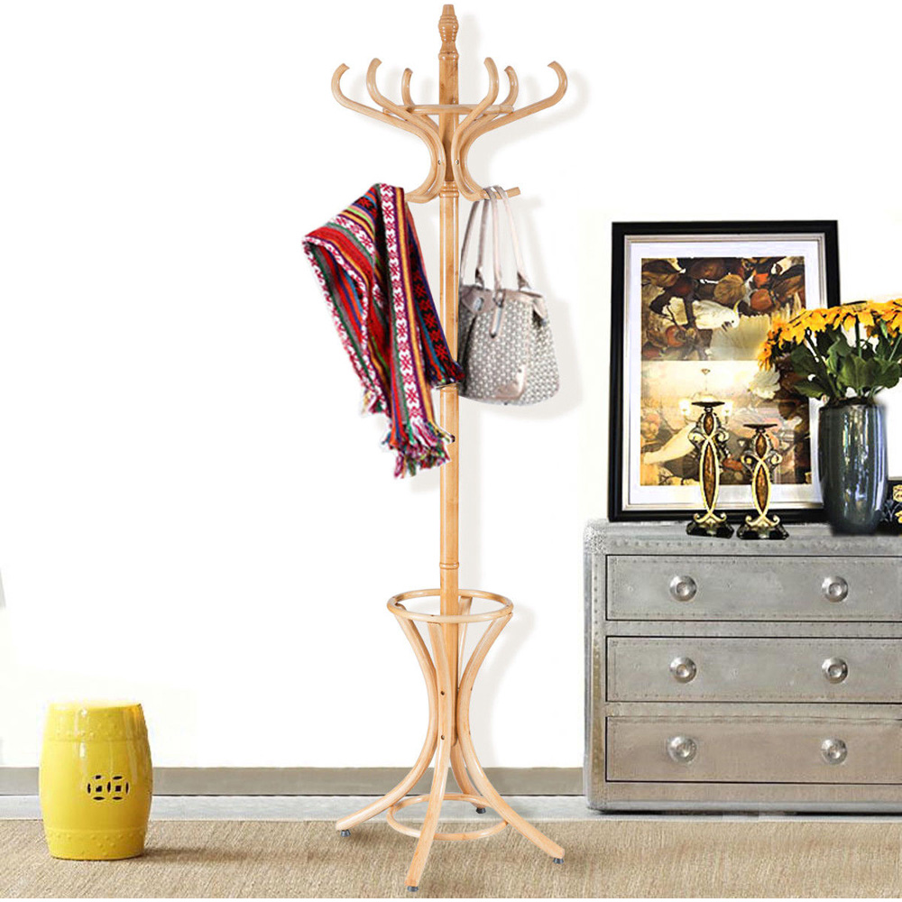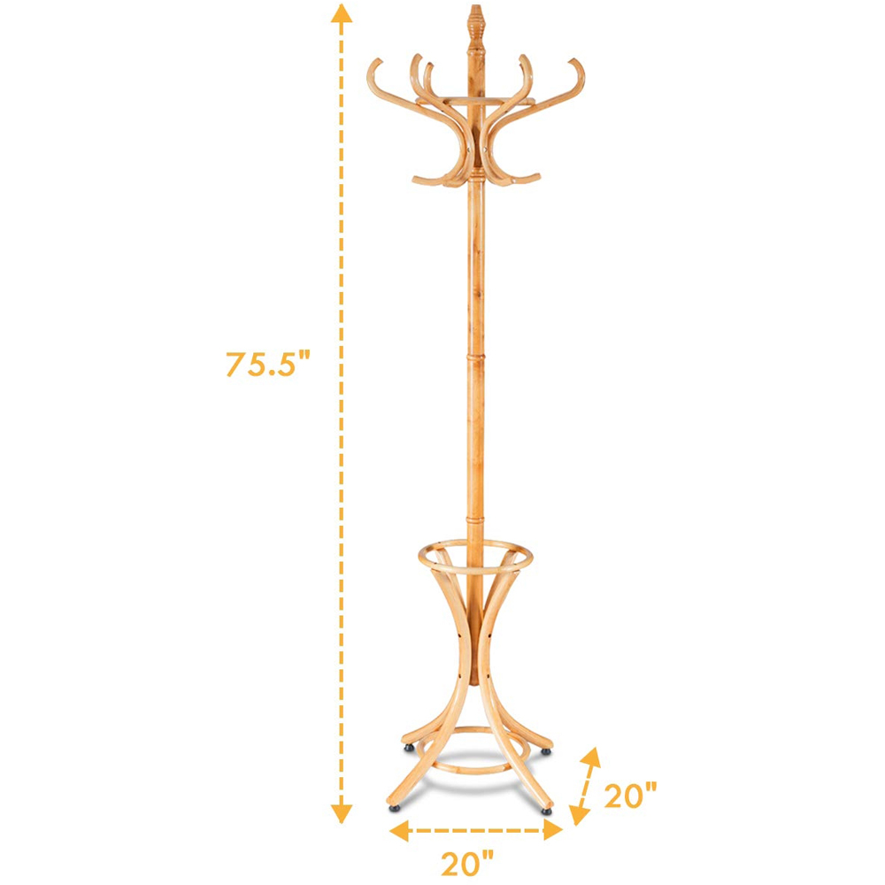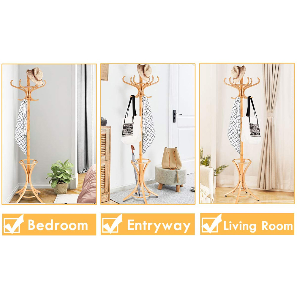 Enjoy the perfect fusion of design and utility with the Costway Oak Standing Coat Rack. This elegant floor-standing coat stand features a sleek finish with a light, glossy aniline lacquer. It helps you to protect your stand from natural elements. Crafted from unique quality birch and poplar wood, it is both durable and stylish. Ideal for hanging your coats, jackets and hats on, this supreme stand would look good in a hallway or anywhere in your home. This coat stand has an umbrella rack, which is most useful for wet weather in the United Kingdom. It offers superior stability compared to other coat stands, with a section at the base for umbrellas, six coat hooks, and six additional hooks for scarves, hats, and trousers. Every top and edge are polished to protect users from scratching or stabbing. This stylish and practical shabby chic stand will add a touch of French glamour to any home.