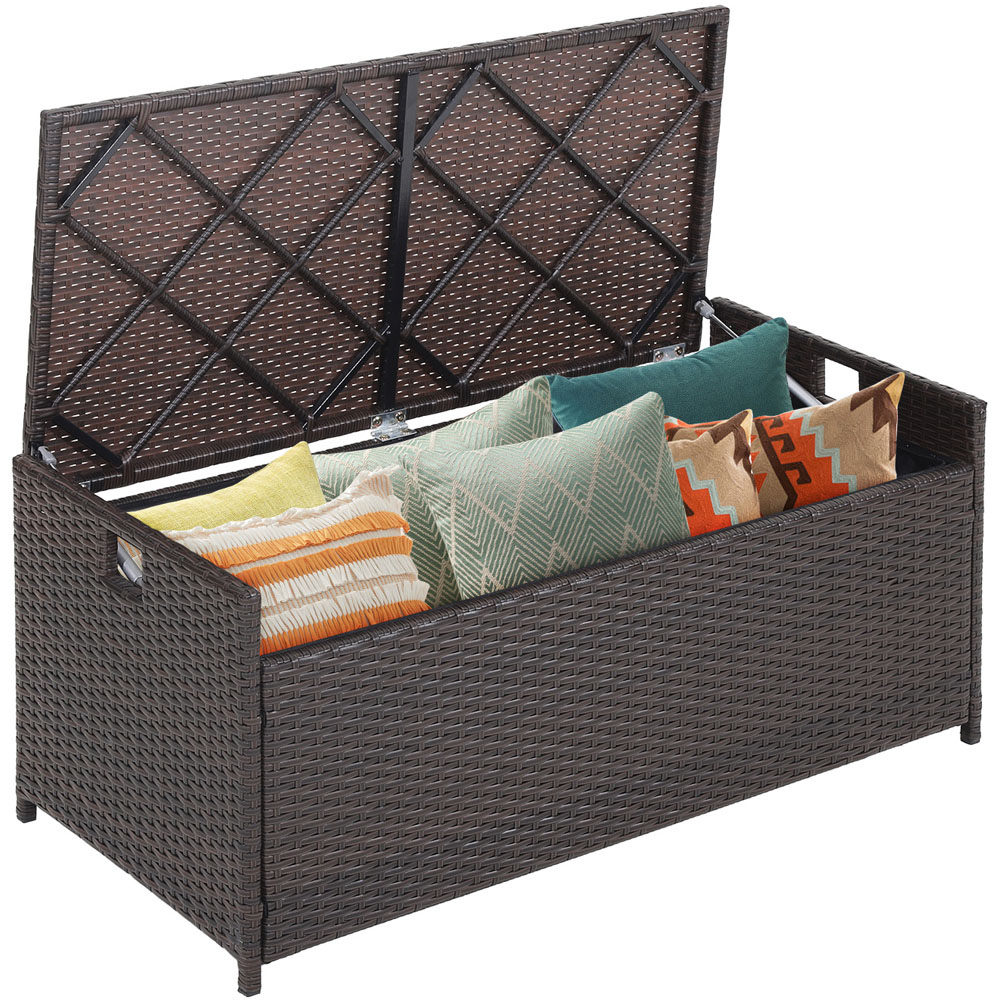 Make a delightful and practical addition to your interior space with the Costway Patio Storage Bench with Cushion 128L. It is crafted using a hand-woven mix of brown PE rattan and heavy-duty metal for durability and longevity. This bench features storage space for keeping cushions, blankets, pillows, toys, tools and other essentials. You can put a cushion on the covered lid to use it as a bench or remove the cushion to use it as a coffee table. The cut-out handles on the two sides make the box easy to move. The two gas struts firmly support the lid and save much effort to open or close the lid. The zippered PU-coated polyester liner resists water and dust, offering considerate protection to the items inside. The smooth zipper makes the cushion cover easy to remove and wash for maintenance. The assembly of the storage box is quite simple with the help of clear instructions. Please do not tighten all the screws until all the holes are aligned. Please Note: Always keep the cushion dry to prolong the service time.