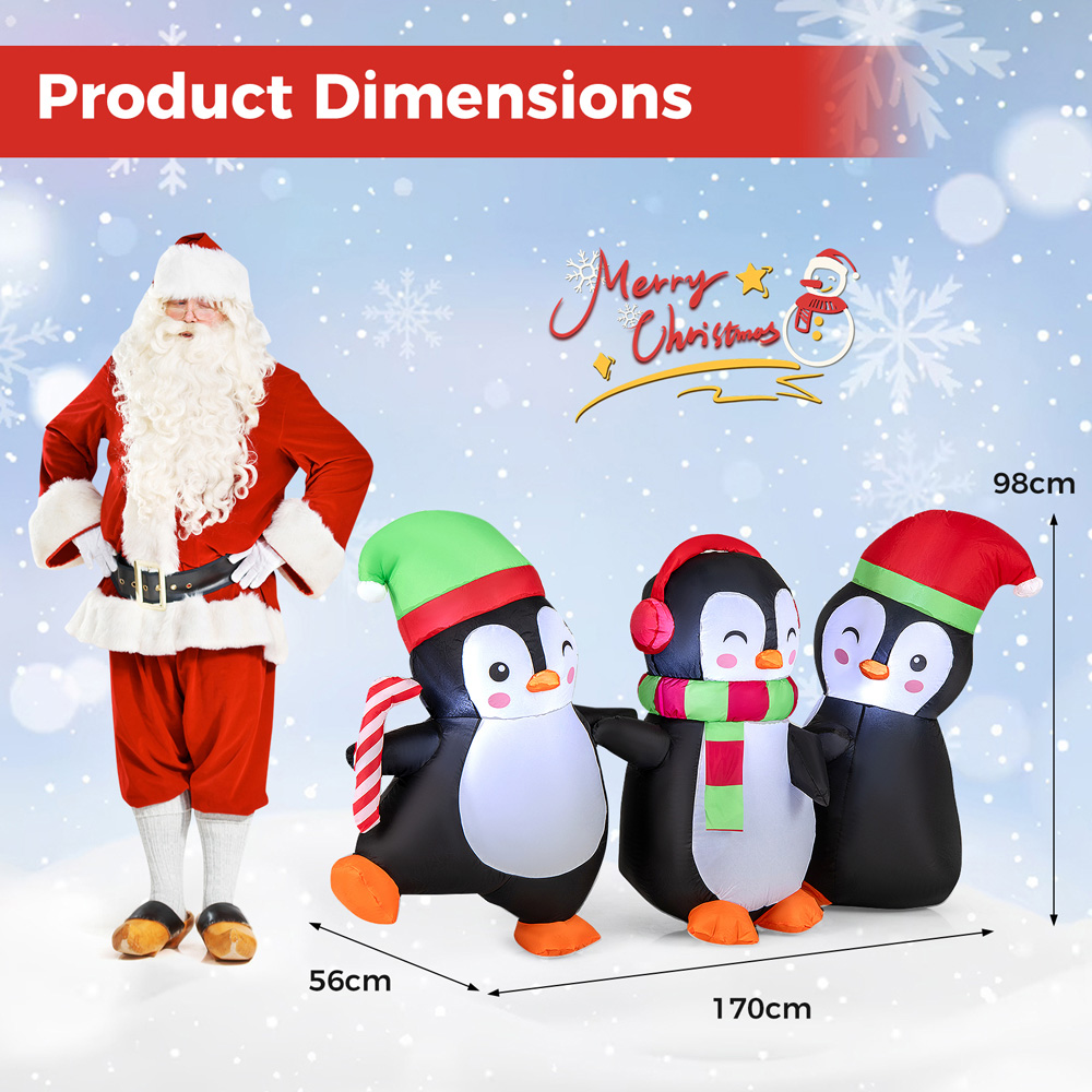 Create a magical Christmas scene with a delightful hand in hand LED penguin set that brings instant festive cheer to your garden or porch. Featuring three smiling penguins dressed in Santa hats, headset and scarf, this large 170cm outdoor inflatable penguin family with LED lights self-inflates in minutes with a built-in blower and stays stable outdoors thanks to water bags, stakes and ropes. Crafted from durable 210T polyester, the large LED lighted penguin family garden inflatable for Christmas is waterproof, windproof and snow-resistant, so you can enjoy glowing, vivid penguins day and night that everyone will love.
