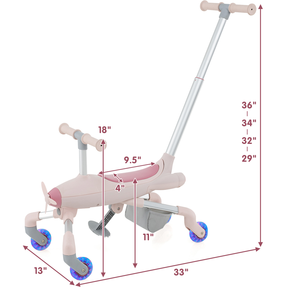 Encourage active play for your little one with the Costway Pink 2 in 1 Kids Ride On Push Car. This ride-on push car switches between a parent-push mode and a child-driven mode, catering to kids of varying ages. Ensuring the cosiness of parents, the ride-on toy features a 4-position adjustable parent handle with a detachable design. While the anti-slip handlebars and cosy PU seat provide comfort for kids. The push car includes colourful LED lights for unparalleled fun. Crafted with premium aluminium tubes and PU wheels, this push car is built to last as your child grows. Additionally, the large storage basket allows for easy access to toys and items. Boasting a plane-themed design, this ride-on toy car is the perfect gift for children aged 18-60 months old. It enhances the development of confidence, balance, and motor skills, while also fostering parent-child interaction. This innovative design features a detachable push handle and foldable footrests, ensuring a seamless transformation process. This ride-on push car will entertain your child with its colourful LED lights. During driving, the lights glow and the propeller rotates. Additionally, the all-terrain PU wheels traverse on various surfaces such as asphalt roads, wooden floors, cement roads, or grasslands. Built with anti-rust aluminium tubes, the 2-in-1 push car is lightweight yet sturdy. It complies with EN71 standards, supporting up to 50 kg and providing peace of mind for parents. Thanks to the spacious storage basket, children can easily take their favourite toys or other items.