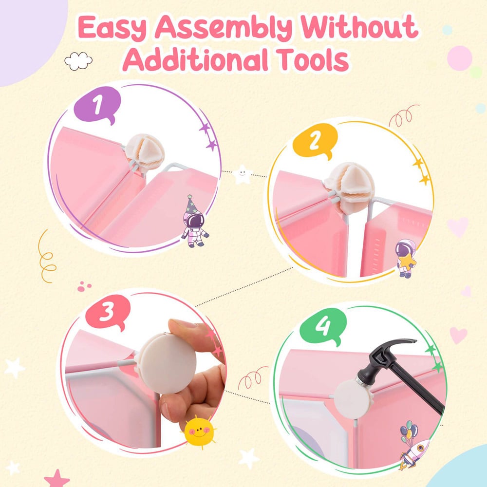 Make a versatile addition to your little one's room with the Costway Pink 8 Cube Baby Closet Organiser. This storage organizer has eight spacious storage cubes and a dedicated hanging section for your baby's clothes, offering easy accessibility. The cute patterned doors not only hide any mess but also add charm to the room's decor. Crafted from high-quality PP material, the kids' dresser is odourless, ensuring a safe environment for your kids. Its smooth and waterproof surface makes cleaning a breeze, and the lightweight material allows for easy movement. Additionally, the built-in rings on the doors serve as convenient handles and ventilation holes. The package includes 29 square panels, eight door panels, 32 connectors, a hanging pole, and a handy hammer. Also, assembling this cube organizer is quick and effortless with a few hammer strikes.