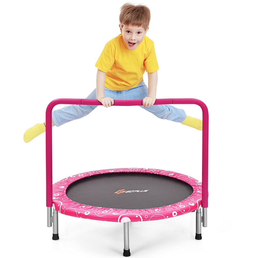 Discover the joy of exercising with the Costway Pink Folding Children Trampoline with Padded Edge Cover. The trampoline features a 92cm diameter, allowing children to bounce and exercise safely. It features a padded safety cover that protects children's feet from getting stuck in the bungee cords. The trampoline also has a soft foam cover that fully wraps around a removable handle, providing better grip and preventing slips. This trampoline is quiet, thanks to its 30 durable bungee cords attached to the mat instead of springs. The anti-slip rubber foot pads reduce noise, prevent scratching on hard floors, and keep the trampoline from moving around. It is suitable for children aged three to 10 years, providing a fun way to exercise, burn energy, promote blood circulation, and develop balance. The handle is removable for when your child no longer needs assistance. Conveniently, this trampoline is foldable. The base can be folded in half by removing the handle and legs, making it suitable for travel or storage. This folding trampoline is ideal for indoor and outdoor use, thanks to its rust-resistant steel frame and weather-resistant mat. It has a maximum weight load of 150kg, and adult supervision is recommended for young children.