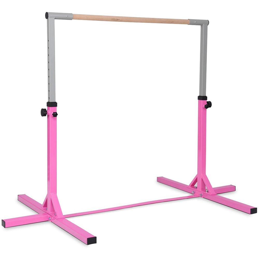 Encourage active play for your little one with the Costway Pink Kids Adjustable Gymnastics Training Bar. It features an extremely solid steel frame for maximum stability, which serves to last for years and support up to 100kg. Meanwhile, the triangular structure on the bottom ensures overall stability. Specially designed screw knobs make it easy to adjust the height from 90cm to 150cm with 12 height options. The horizontal bar perfectly meets the needs of kids with different heights and skill levels. Additionally, the lockdown knob is equipped for double safety. The bottom of the kid's gymnastics bar is covered by non-slipping rubber pads, which not only protect the floor from scratches but also minimize swaying and wiggling of the bar to offer extra stability and safety. The training on the horizontal bar can not only improve your kids' balance but also make the body stretch well while the movement on the horizontal bar makes the body more flexible. Ideal gift for your kids to start their exercise for better body shape! The gymnastic training bar comes with a super-easy assembly. All parts are included, and you can set it up within minutes. Apart from that, the powder coating on the surface makes the bar rust-resistant, which is also easy to clean and maintain. Note: For your protection and the safety of the product, do not use the product outdoors.