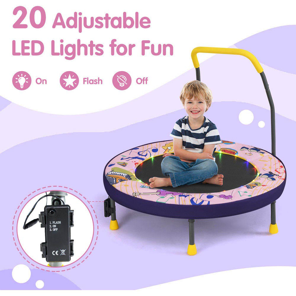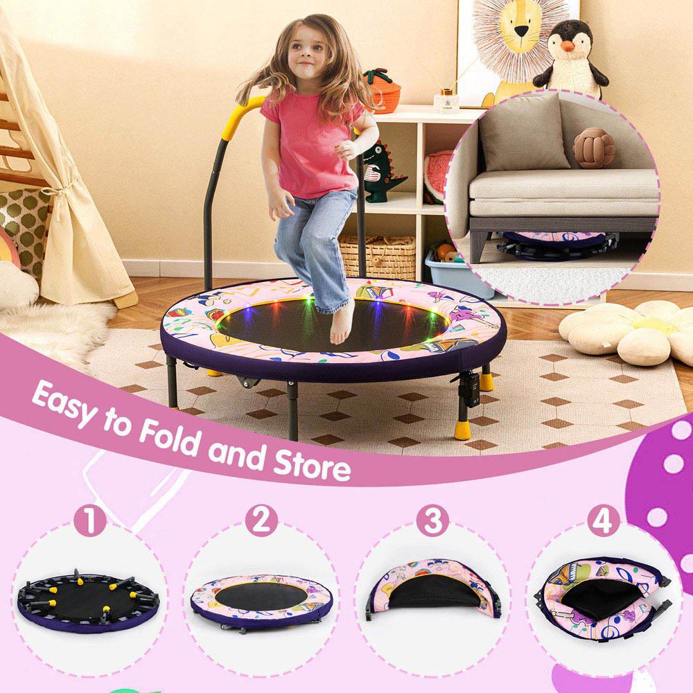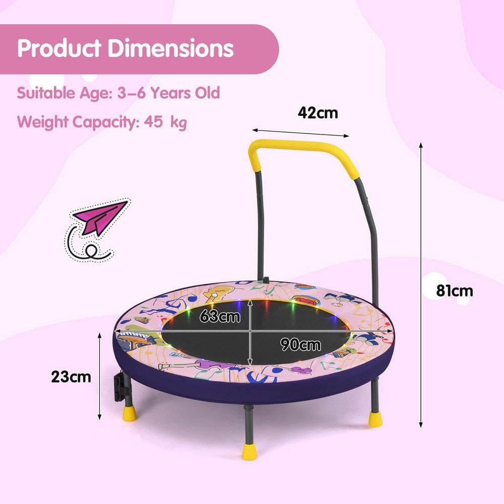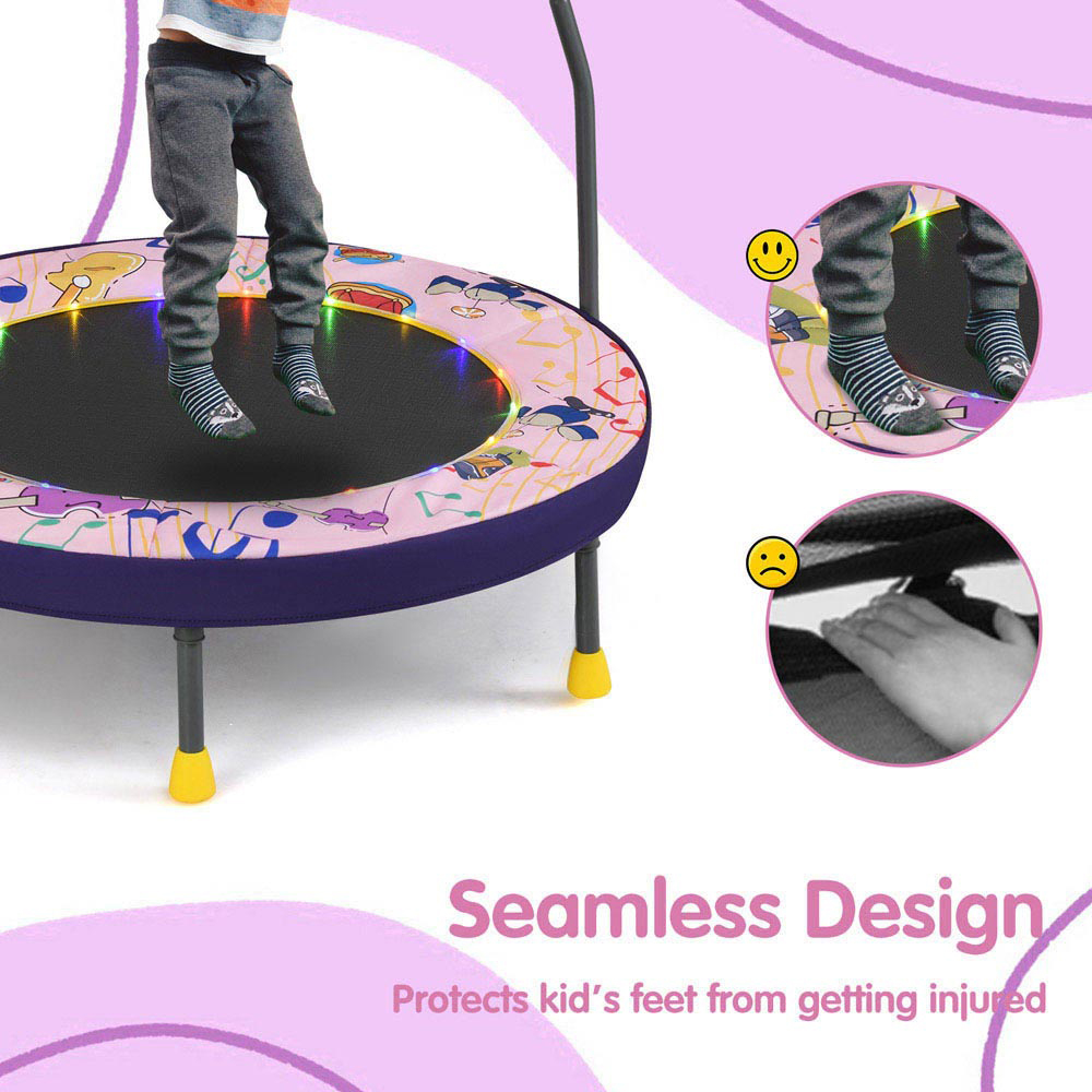 Brighten up playtime with the Costway Kids Folding Mini Trampoline, featuring colourful LED lights and a padded safety cover in a delightful pink hue. This trampoline ensures a safer bounce with its springless design, utilising 20 bounce tension bands for a more even and responsive jump. It's built to last with a powder-coated frame and non-slip foot pads, enhancing stability and durability whether used indoors or outdoors. Easy to assemble and foldable for convenient storage, this trampoline meets EN71 and ROHS compliance, making it a secure and fun choice for your little ones.