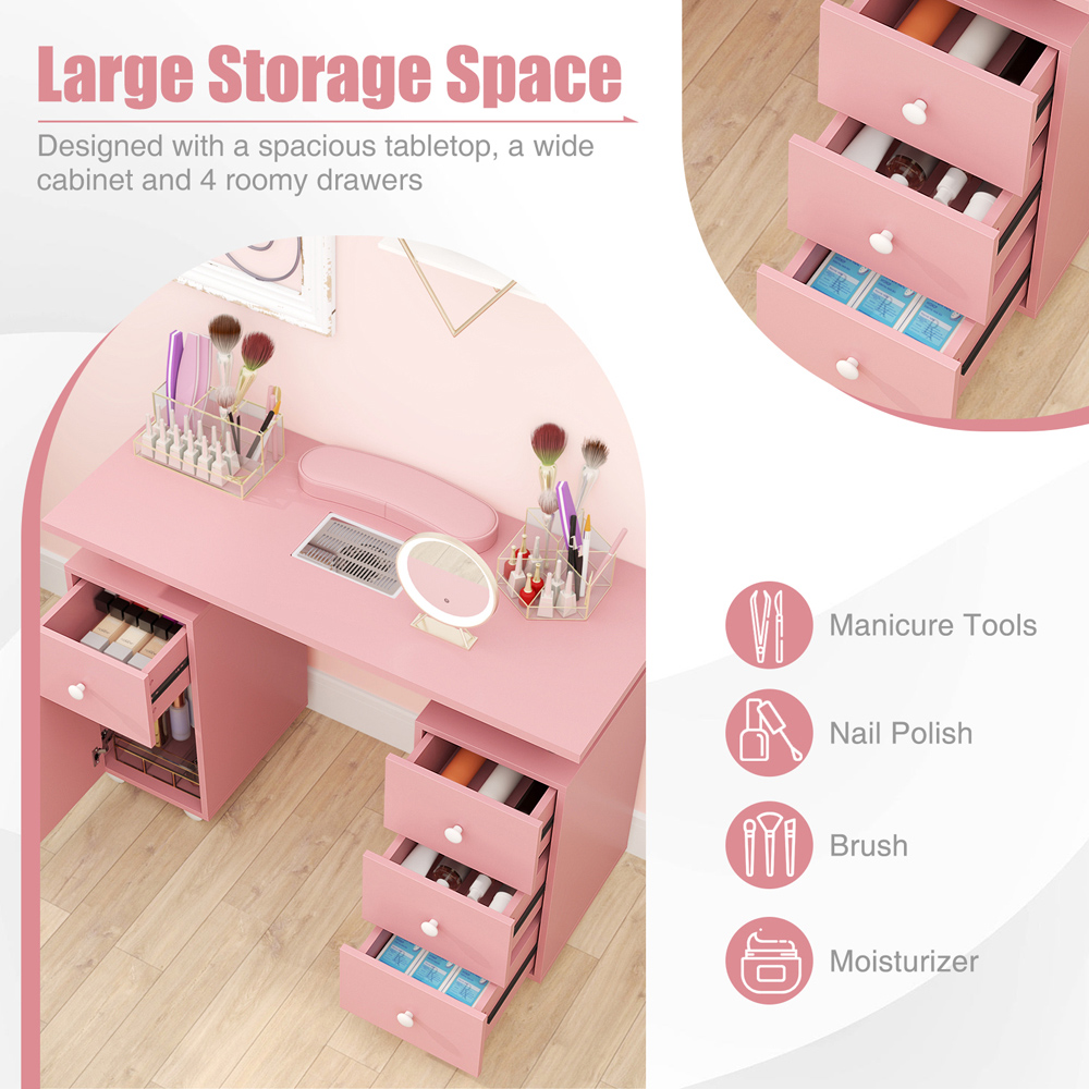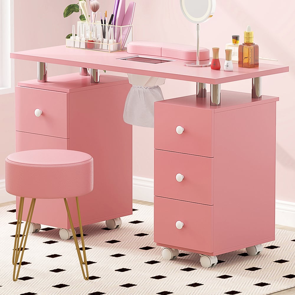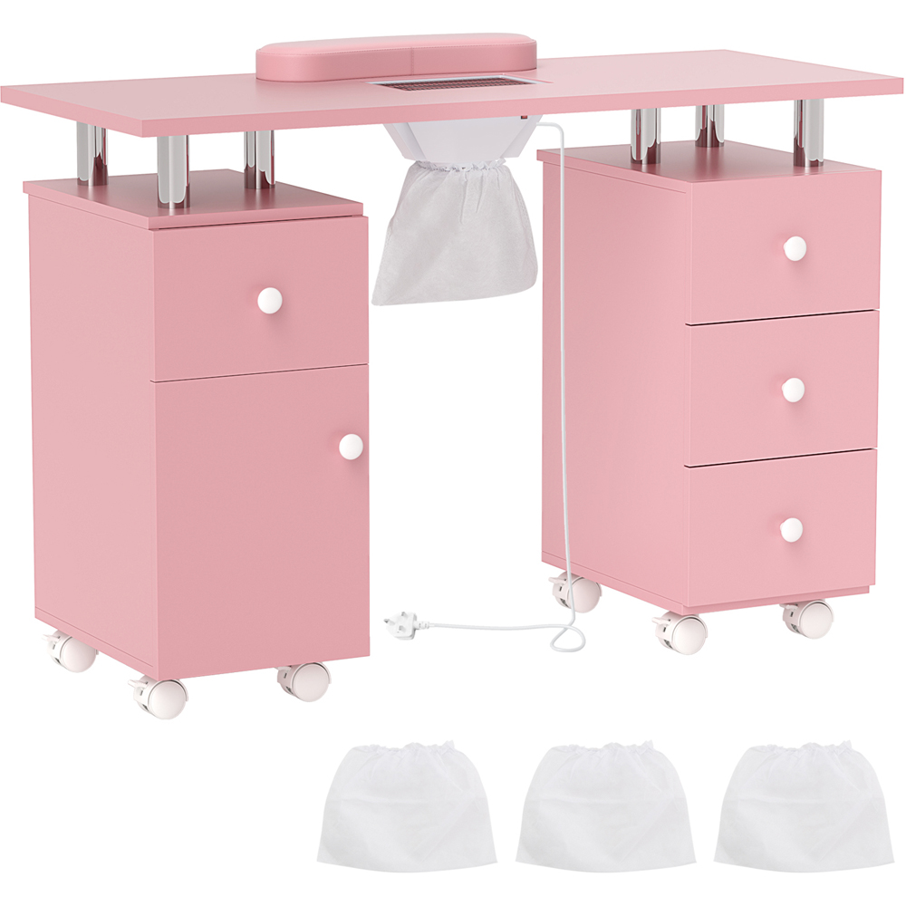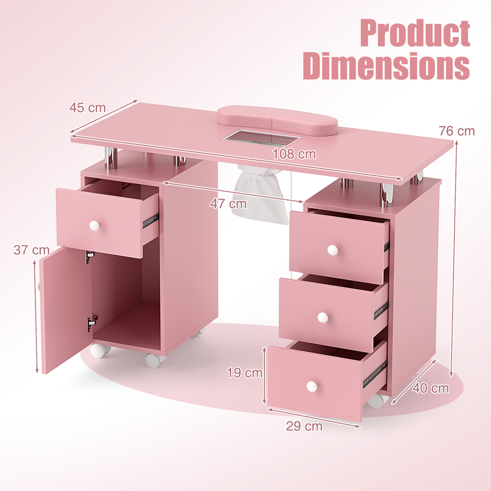 Elevate Your Nail Care Experience to New Heights! The premium manicure table is meticulously designed to meet the needs of nail technicians and beauty enthusiasts. Say goodbye to nail dust residue with the powerful dust collector and three reusable dust bags, ensuring a clean and professional workspace. Crafted from a premium acetone-resistant tabletop and a sturdy stainless steel frame, the nail desk is a reliable and practical choice for professional salons and home use. Furthermore, the inclusion of eight rolling wheels with brakes allows for easy manoeuvrability within your salon space, while the detachable wrist rest cushion provides comfort for your clients during nail treatments. Additionally, the nail art workstation features one large storage cabinet with safe buffered damp hinges and four drawers for classified storage, keeping your nail tools organised and easily accessible.