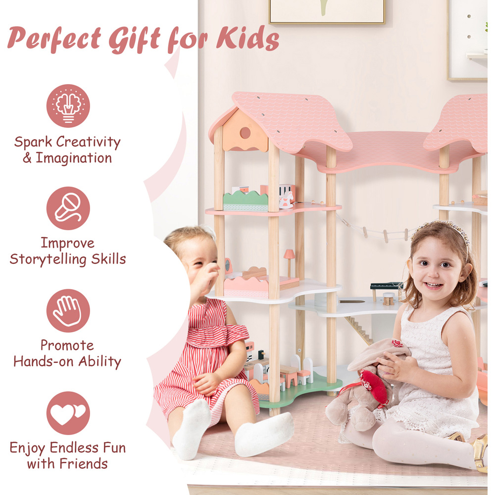 Unlock a world of creative play with this multifunctional Costway Pink Multi-Layer Wooden Dollhouse. Featuring three tiers and seven rooms, children can enjoy hours of fun designing and furnishing their own living spaces. With 33 accessories, including a piano, sofa, and TV, it provides realistic settings for imaginative storytelling.