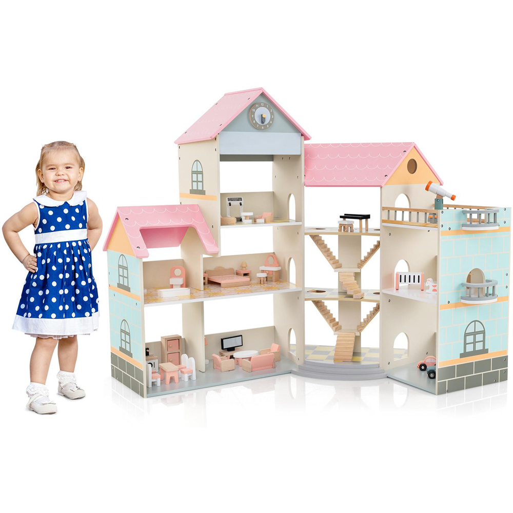 Make the most of your space with this cleverly designed Costway Pink Roof Wooden Dollhouse Playset. Featuring six lovely rooms across three levels, complete with wallpaper and carpets, it offers a realistic play experience. With 42 furniture pieces and accessories, it encourages imaginative design and safe play, making it an ideal addition to any playroom.