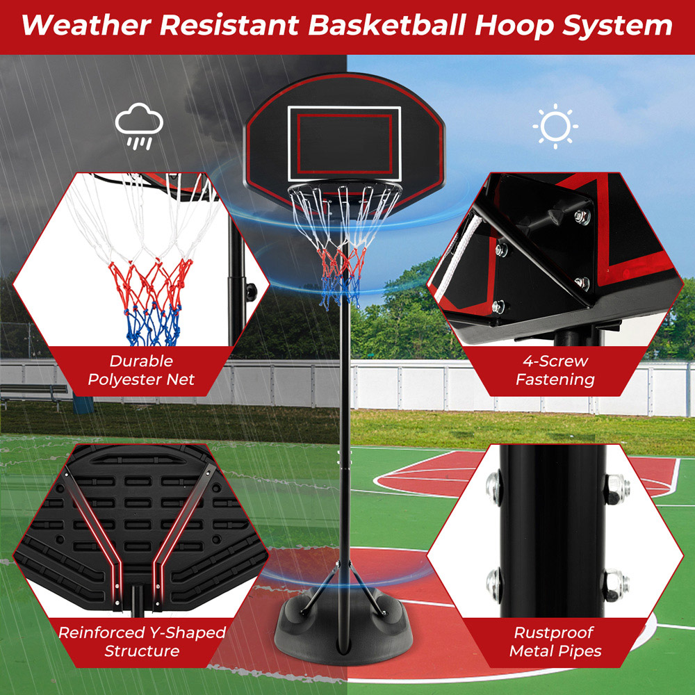 Elevate your game with the versatile Costway Portable Basketball Hoop Set, designed to grow right alongside your kids with its five adjustable heights. Certified by both ASTM and CPSIA, this basketball hoop system ensures safety and durability. The robust PE backboard and base enhance stability and can withstand any weather condition, thanks to the anti-rust, powder-coated metal pipes. Whether it’s for your backyard or the gym, the built-in wheels make it effortless to move, allowing you to enjoy basketball anywhere.