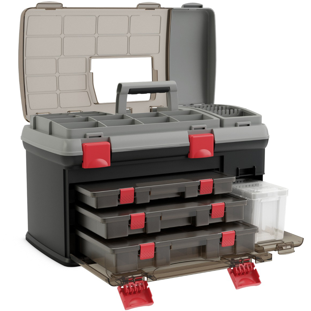 Maximize your fishing adventure with the Portable Large Tackle Fishing Box, designed to cater to all your storage needs with its spacious and customizable compartments. This tackle box features three removable utility boxes, each with dividers to keep your hooks, lures, and other essentials sorted and easily accessible. The double layer top storage compartment provides additional space, with the upper layer offering 14 small compartments and the lower layer featuring a large compartment with three lure racks. Built from high-quality PP and PC materials, this box is crafted to endure the outdoor elements and keep your fishing gear secure, all while being easy to transport thanks to its foldable handle and secure locking latches.