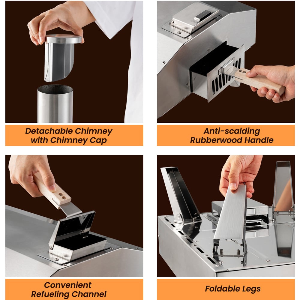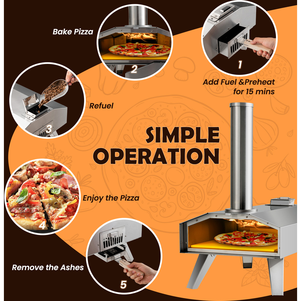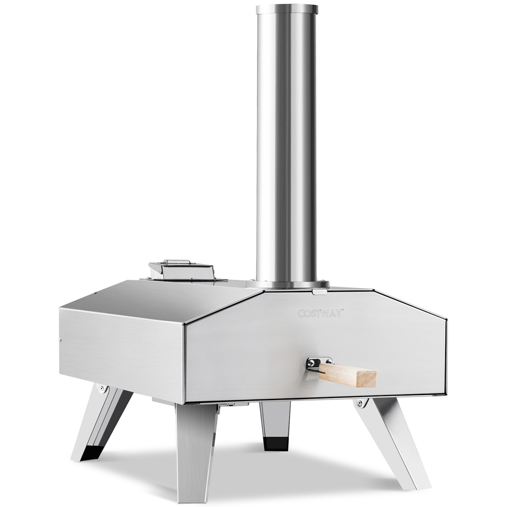 Now enjoy outdoor cooking with the Costway Portable Outdoor Stainless Steel Pizza Oven. This partly pre-assembled pizza oven is easy to set up with all necessary tools included. Simply add wood pellets to the fuel grid, close the oven door, and pre-heat for 15 minutes. The oven can reach up to 460°C, baking a pizza in just 5 seconds. It also cooks steak, fish, and egg tarts. The oven features a removable ash tray, anti-scalding rubber wood handles, and a long poker for safe operation. Constructed with double-layer, anti-rust stainless steel, it ensures durability and excellent cooking performance. The portable design with Dimensions: H17 x W35.5 x L54.5cm and weighing 10.5 kg, allows for easy storage and transport. The set includes a cordierite pizza stone, poker, rubber wood handles, detachable chimney, ash tray, and pellet grid. Ideal for backyard, camping, and picnics.