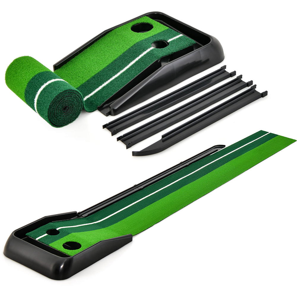 Enhance your golfing skills with the Costway Premium Golf Practice Turf 250cm. This mat is meticulously crafted with a smooth PP surface to mimic the authentic feel of a golf course, ensuring a realistic ball roll every time. The anti-slip rubber bottom provides the stability needed for accurate practice, while the innovative auto ball return system sends balls rolling back to you, allowing for continuous play. Whether you're a beginner or an experienced golfer, the clear alignment guidelines aid in improving your aim and putting technique. Plus, it's easy to store and transport, making it perfect for any location.