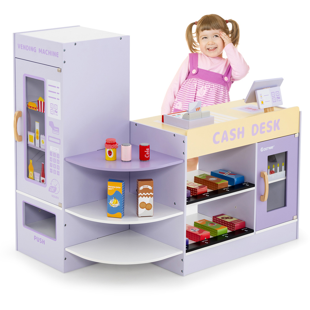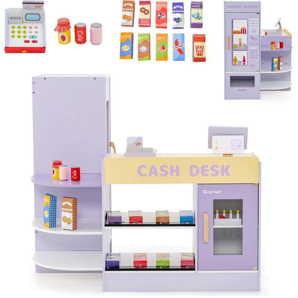 Engage your children in fun and creative activities with Costway Purple Kids Wooden Grocery Store Supermarket Toy Set. This grocery store set, complete with a checkout counter and vending machine, offers kids a realistic supermarket role-play experience. They can check out items or write prices on the chalkboard, and the multiple storage shelves help them organize groceries, fostering good habits. This set also aids in developing fine motor skills, hand-eye coordination, creativity, and imagination. The set includes a screen, POS machine, scanning area, and conveyor belt patterns for a true checkout experience, along with a fun vending machine for simulated shopping. The writable chalkboard adds an extra layer of fun. It comes with 13 play food items, including canned drinks, juices, biscuits, sweets, and more, providing a realistic experience. Made from thick boards and solid wood accessories, this grocery store set is durable and safe, with rounded corners to prevent scratches. It features 3 open shelves, a 2-tier display rack, and a single-door cabinet with a shelf, offering ample storage space for organizing groceries. This helps kids develop good organizational habits. Ideal for children aged 3-8, this educational toy promotes learning about calculation, hands-on ability, imagination, and creativity. It makes a perfect gift, providing endless fun and learning opportunities.
