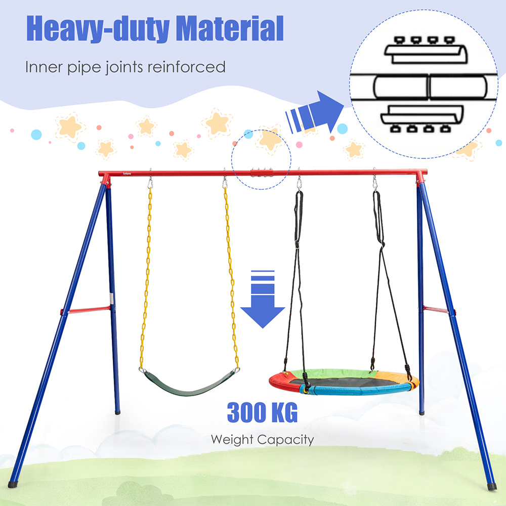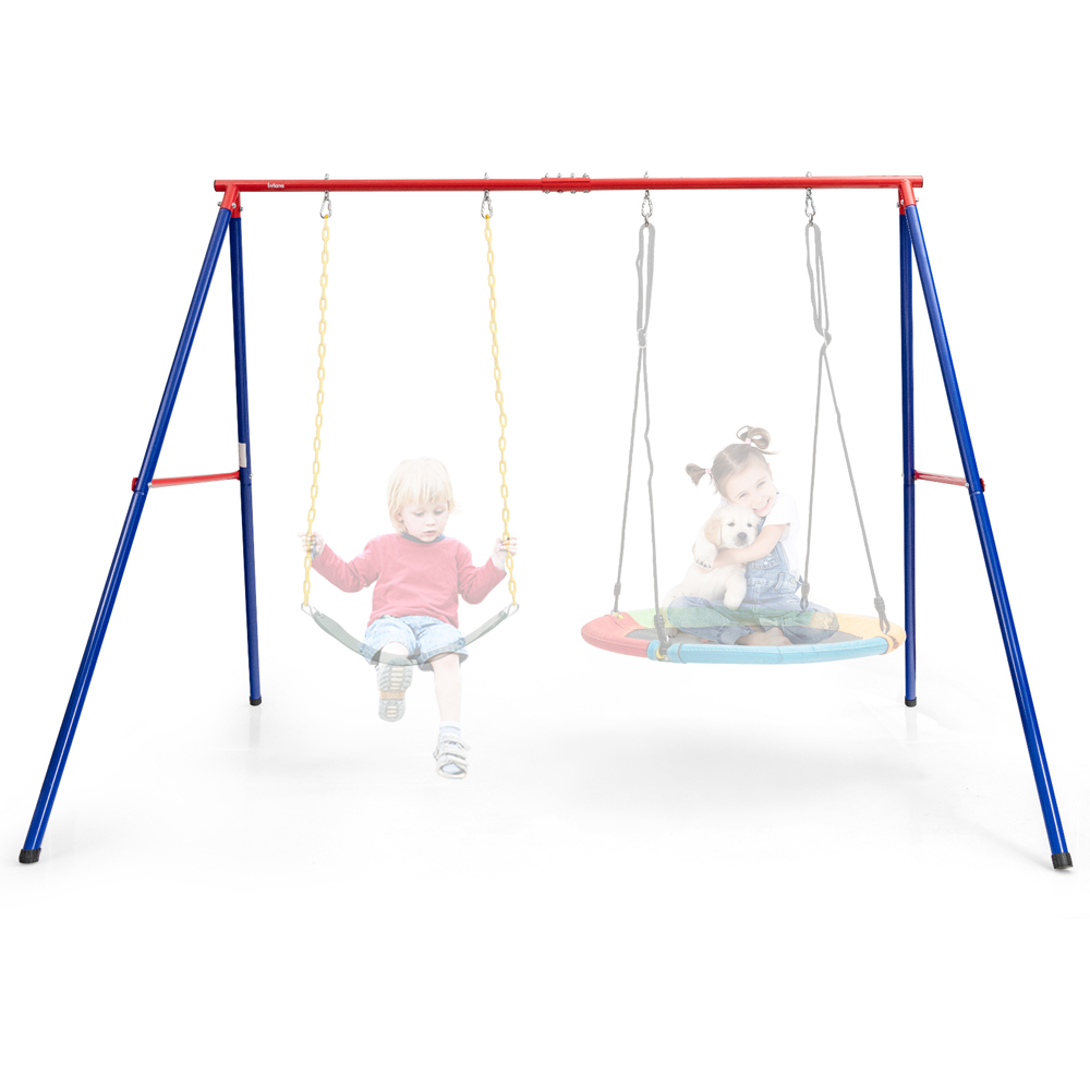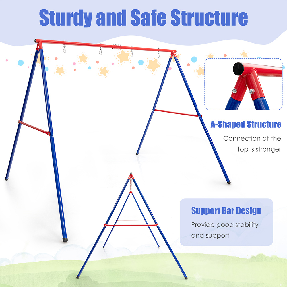 Transform your garden or indoor play area into a thrilling adventure zone with the Costway Red and Blue Large Metal Swing Stand, featuring a robust A-frame design. Boasting an impressive width and height that surpasses the average market size, this swing stand ensures ample room for safe and joyful swinging. Constructed from heavy-duty iron pipes, it supports a weight capacity of up to 300kg, making it perfect for various swing types like net swings, swing chairs, or even a yoga rope. Its anti-rust finish and weather-resistant properties guarantee longevity and minimal maintenance, whether used indoors or outdoors. In addition, four removable foot caps are designed to protect your floor from scratches when you use this swing stand indoors. With easy assembly and the ability to clean effortlessly, this swing stand promises endless fun and stability for all your swinging needs.