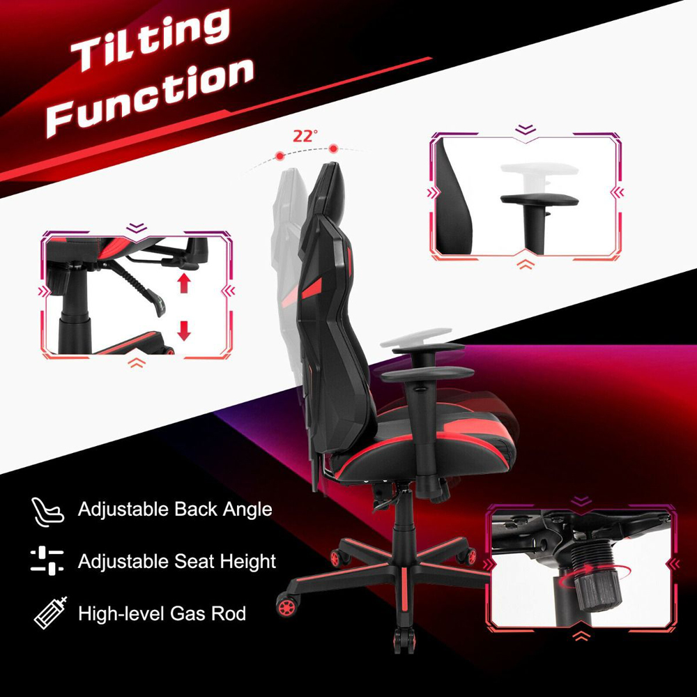 Immerse yourself in the ultimate gaming experience with the Costway Red Ergonomic Gaming Chair. Featuring a tilting function and adjustable height, this chair allows you to lean back and enjoy a perfect tilting angle of up to 22˚, ensuring freedom of movement during intense gaming sessions. The seat, covered with waterproof PU leather and filled with a soft sponge, offers unparalleled comfort, while the breathable mesh backrest ensures you stay cool. Ergonomically designed with 3D spine support and a lumbar pillow, it effectively protects your spine and reduces waist fatigue. Smooth movement is facilitated by the five swivel casters, and the sturdy steel frame supports up to 150kg, making it a versatile and durable choice for any gaming setup or office environment.