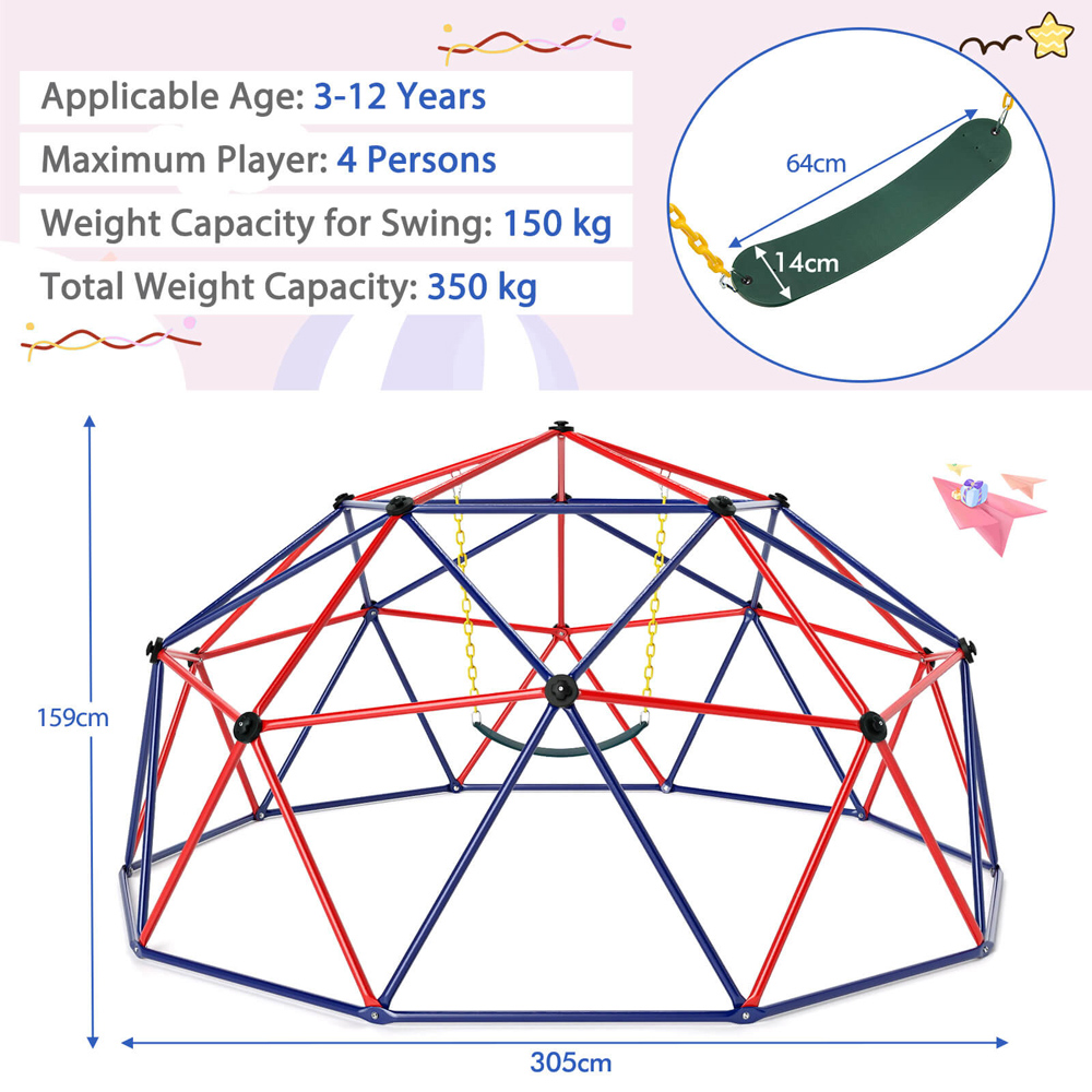 Elevate playtime with the Kids Climbing Dome with Swing Jungle Gym Monkey Bar Playground Set! This vibrant green playground set is a fantastic way for children aged three to twelve years old to enjoy outdoor fun while boosting their physical and cognitive skills. Designed to accommodate up to four kids with a load capacity of 350kg, it features an internal swing, rock climbing handles, and convenient climbing bars for a safe and thrilling adventure. The dome's construction utilises hot-galvanized, anti-rust metal pipes, ensuring durability and long-term use in both indoor and outdoor environments. It's easy to assemble and clean, making it an ideal choice for parents looking to reduce children's screen time and encourage active play.