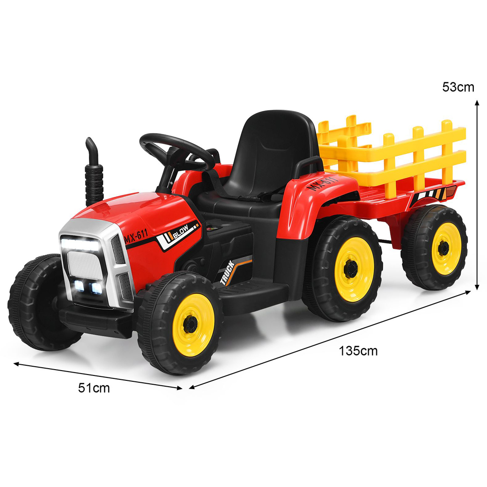 Bring endless fun to your child's playtime with the Costway Red Kids Musical LED Ride On Tractor. Equipped with a detachable trailer, it's perfect for transporting toys and treasures. With soft-start technology, safety belts, and wear-resistant wheels, your child can drive safely on various surfaces. The built-in audio system adds more fun, with music options via USB or Bluetooth.