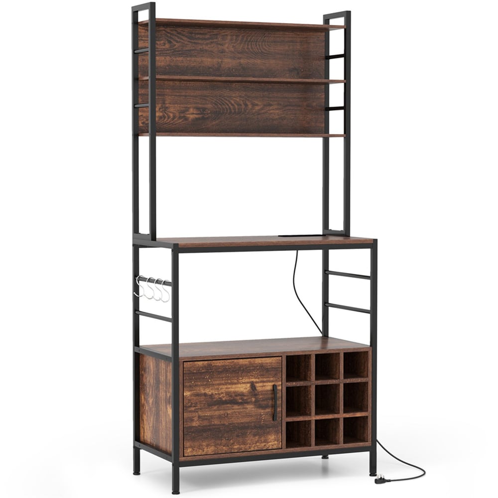 With various storage options, such as open shelves, a cabinet, hanging hooks, and wine bottle holders, this microwave stand offers a comprehensive organization solution for your kitchen items. Additionally, this coffee bar cabinet is equipped with a UKCA-certified power outlet, featuring two AC outlets and two USB ports for charging devices and using electric appliances. The anti-rust metal frame provides stability, while adjustable foot pads ensure that the cabinet remains steady on uneven surfaces. To further secure the kitchen baker's rack, there are 2 anti-toppling devices that can be attached to the wall. Guardrails on each shelf also help to keep belongings in place. Overall, this versatile baker rack effortlessly combines functionality and style, making it a perfect addition to your kitchen, dining room, or living room. Boasting a UKCA-certified power outlet, this kitchen baker's rack includes two AC outlets (250V/13A) and 2 USB ports (5V/2.1A), allowing you to conveniently charge devices and use electric appliances. The 140 cm power cord adds to the convenience of charging.
