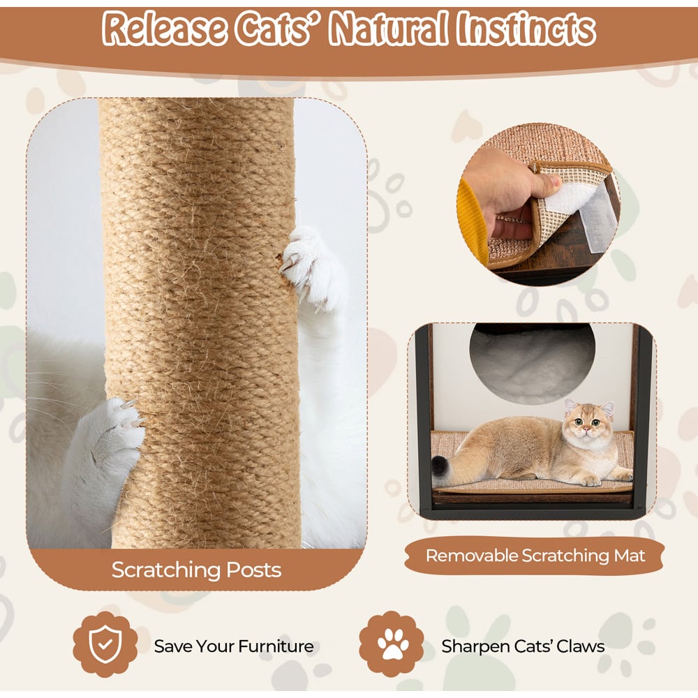Your pet cats will experience the ultimate indoor fun activity with the Costway Rustic Brown Cat House with Scratching Post. It is a space-saving cat furniture with an all-in-one design that features a space for the cat with decent storage space. It is designed with a spacious condo, so the cat can have fun and sleep according to their preference. Your kitten can take a nap on the warm and non-shedding cushion, which can easily be removed and washed for convenient cleaning. This cat house includes a hanging plush toy that serves as the ideal playmate for your kitten. The scratching post and mat are designed to sharpen cats’ claws and save your furniture from getting damaged. It is crafted using a solid metal frame and premium MDF with a textured wood grain finish. The adjustable foot pads ensure stability and support with a sturdy design. This side table can be fixed to the wall using the anti-tipping device to prevent accidental damage. The cat cabinet and end table combination serve as a convenient table or nightstand, providing space to hold your books, laptops and other belongings in your living room or bedroom. This table has a load-bearing capacity of 40kg.