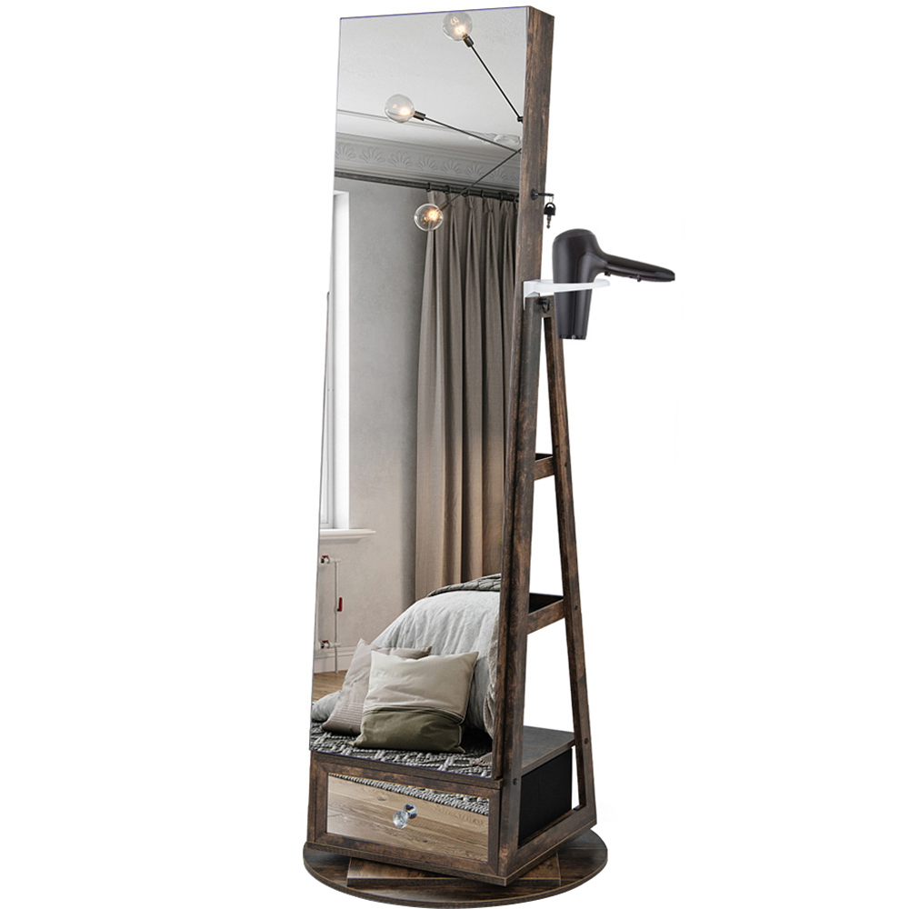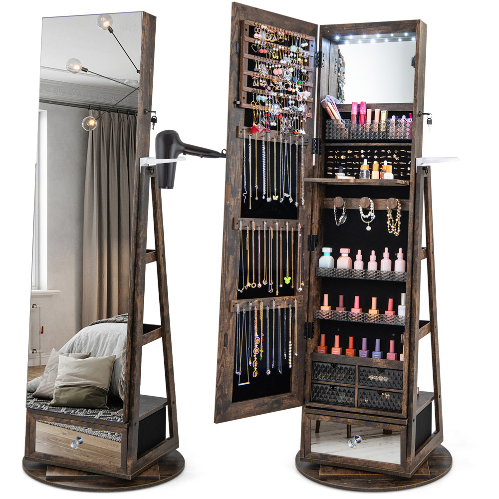 Make a classy addition to your interior space with the Costway Rustic Brown Wall Mirror with Cabinet 37 x 140cm. This incredible cabinet comes with a range of features that satisfy all your jewellery storage needs. There are six rows of earring racks, three rows of necklace hooks and five rows of ring slots with one foldable shelf. It includes a hairdryer rack, an acrylic lipstick box, three bracelet rods, two detachable acrylic shelves, four acrylic drawers and one foldable non-woven fabric drawer at the bottom. There are three additional storage shelves at the back, providing more space for your accessories. The outside of the jewellery boasts a full-length mirror, while the inside features a small vanity mirror. The built-in LED lights create the perfect lighting for finding your favourite pieces. It is equipped with 108 earring slots, 36 earring stud holes, 36 necklace hooks, one acrylic cosmetics lipstick box and 65 ring slots. The lights are powered by 3 x AAA batteries (not included). The foldable acrylic makeup shelf can be flipped down to place cosmetics during your makeup. The jewellery armoire features a lockable door with keys to keep your belongings safe.