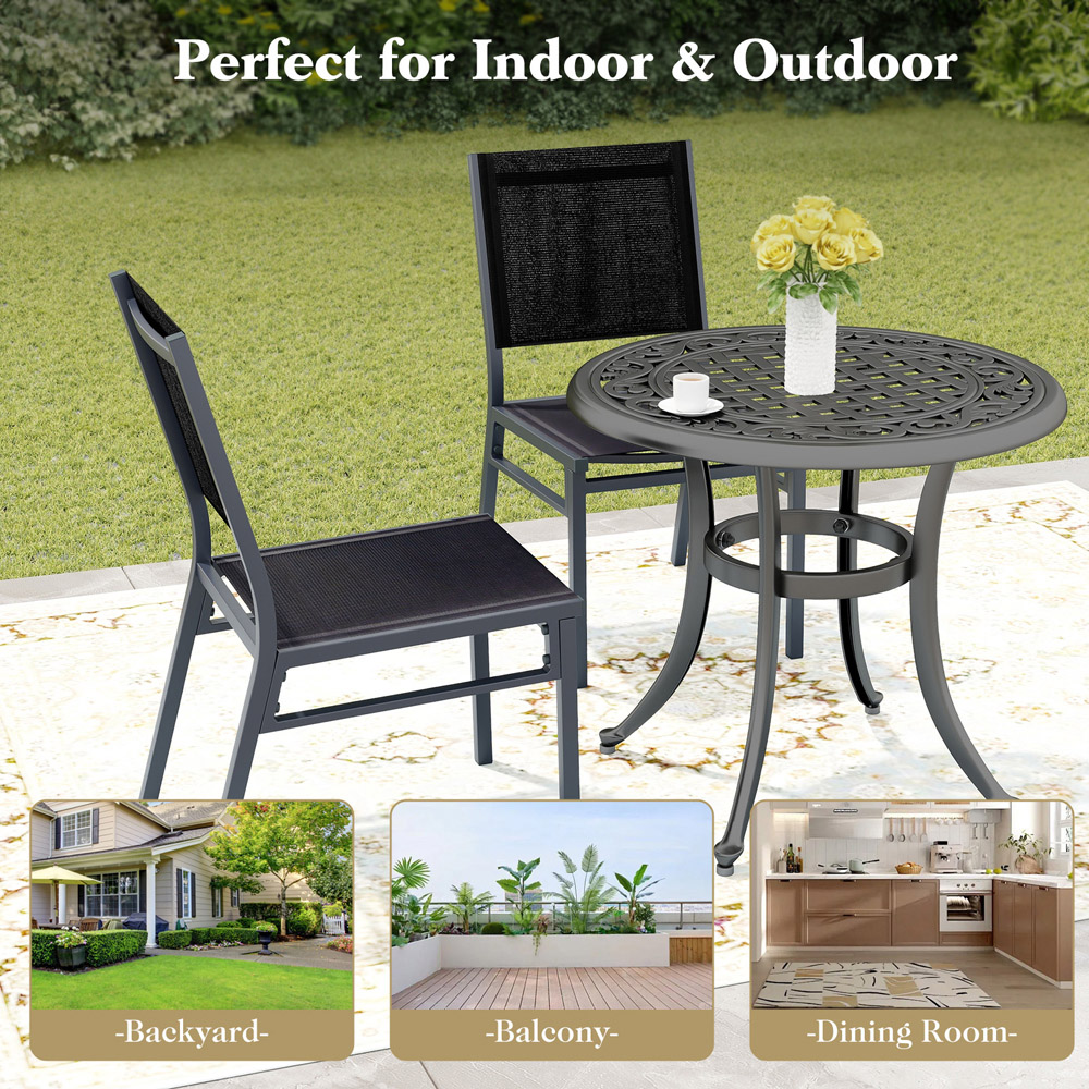 Transform your outdoor space with the Costway Set of 2 Aluminium Garden Chair. These chairs are built with sturdy aluminium frames that are rustproof and lightweight, perfect for any indoor or outdoor setting. They feature premium, quick-drying seat fabric that is breathable and fade-resistant. The ergonomic backrest supports the natural curve of your back, ensuring hours of comfort. Whether for your backyard, balcony, or dining room, these chairs provide both style and comfort for any occasion. Despite their robust build, the chairs are surprisingly lightweight at only 3kg each, making them easy to move. Overall dimensions: H87 x W45 x L60cm.