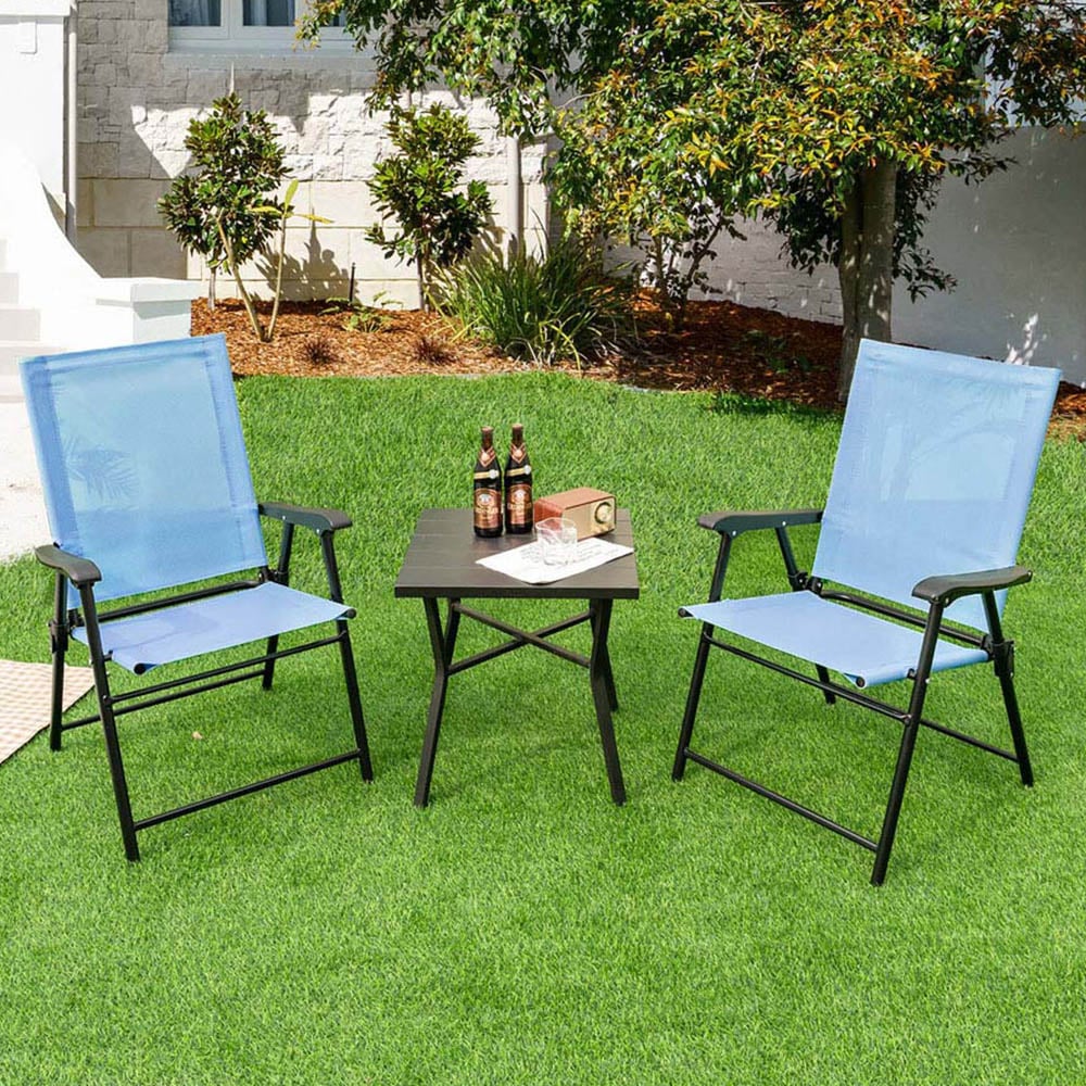 Add a soothing touch to your outdoor space with the Costway Set of 2 Blue Folding Garden Chair. These patio dining chairs feature breathable fabric to avoid stuffiness on summer days. This set is crafted using sturdy and rustproof metal frames for better durability. These chairs have a sturdy metal structure with a 150kg weight capacity. The rustproof design makes them withstand the changing outdoor weather. The locking devices allow you to unlock them with simple folding patterns for easy storage. The lightweight design helps you to carry them with ease according to your preference. This set is quick-drying and wear-resistant, making it ideal for the outdoor environment. It is ergonomically designed with inclined backrests and curved armrests, providing you with a comfortable sitting experience. Dimensions: 93 x 60 x 65cm. You can unbox these chairs, unfold them and they are ready to use.