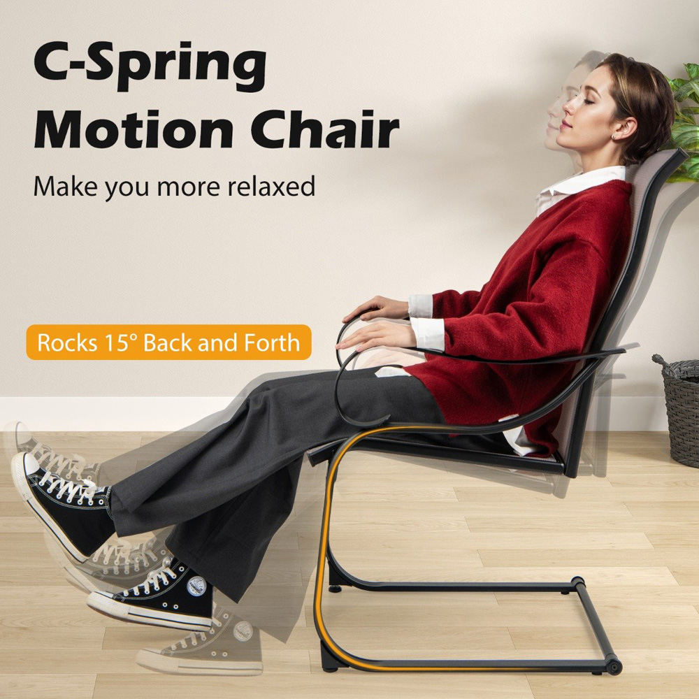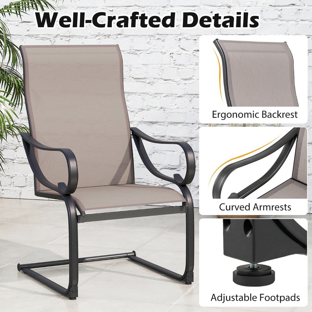 The chairs feature a smooth 15-degree rocking motion and ventilated mesh fabric for optimal comfort. Crafted with a reinforced metal frame, each chair can support up to 150 kg, ensuring durability and stability in any setting. With ergonomic backrests and armrests, the chairs provide both style and support, making them perfect for backyard, porch, and poolside. Elevate your outdoor living experience with these chairs, the perfect choice for unwinding in comfort and style. Experience the ultimate relaxation with the two C-Spring dining chairs. These high-back sling chairs offer a smooth, comfortable 15-degree rocking motion, ideal for unwinding on your patio or poolside. The chairs are designed with ventilated mesh fabric for the seat and back, providing a cool, airy feel that keeps you comfortable during those summer days and warm evenings outdoors. Constructed with a heavy-duty metal frame, these chairs are built to withstand heavy weight up to 150kg. The reinforced structure ensures durability and stability, making them perfect for any setting. Designed with comfort in mind, the ergonomic seat shape of these chairs supports your body as you relax. It’s a thoughtful blend of style and functionality, ensuring you can enjoy your outdoor space in comfort. These chairs are the epitome of relaxation, crafted to provide a serene seating option for your outdoor space, such as backyard, porch, poolside and so on. Overall dimension: 69 x 62 x 108 cm (L x W x H).