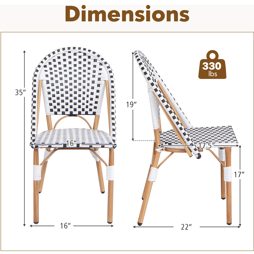 Transform your outdoor space with the Costway Set of 2 White Rattan Armless French Bistro Chair. Made with premium PE rattan, these chairs combine European elegance with durability and comfort. The galvanized metal frame with a wood grain finish ensures stability and rustic charm. Whether on your patio, in a breakfast nook, or at a cosy cafe, these chairs blend function and style seamlessly. They are low-maintenance, easy to move, and suitable for indoor or outdoor use. The ergonomic backrests and H88 x W47 x L57cm size make these chairs a perfect match for most tables and outdoor settings.