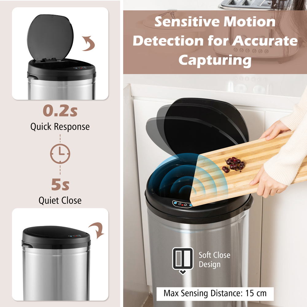 Revolutionise your waste management with the Costway Silver Touchless Manual Control Trash Can with Motion Sensor Control 30L. With its advanced sensor-activated technology and quick hand wave recognition, this innovative trash can open automatically within a 15cm range. Besides, the sensor recognises your quick hand wave, opening in a swift 0.2s and automatically closing after 5s. Plus, it provides the flexibility of two control modes. The sensor control allows for a touchless experience, while the manual control option lets you easily operate the lid with just the push of a button. Powered by 4 AA batteries (not included), this garbage bin offers both sensor control and manual control options. Simply press the "Open" button to keep the lid open as long as needed, and press "Close" to make the lid voiceless comedown. Featuring a 3-tier stainless steel structure including a stainless-steel surface, a drawing wire layer and an anti-fingerprint layer. The anti-fingerprint coating keeps the surface clean and smudge-free, while the stainless-steel material adds a sleek and modern touch to any space. With a generous 30L capacity, this waste bin reduces the hassle of constant disposal. The removable retainer ring adds convenience, making it suitable for use in various settings, including homes, offices, kitchens, and shops. This garbage can is designed for easy assembly, and it includes a clear manual to guide you through the process. The lid has good sealing to prevent pets from flipping over garbage. Additionally, the convenient handle makes it easy for you to carry.