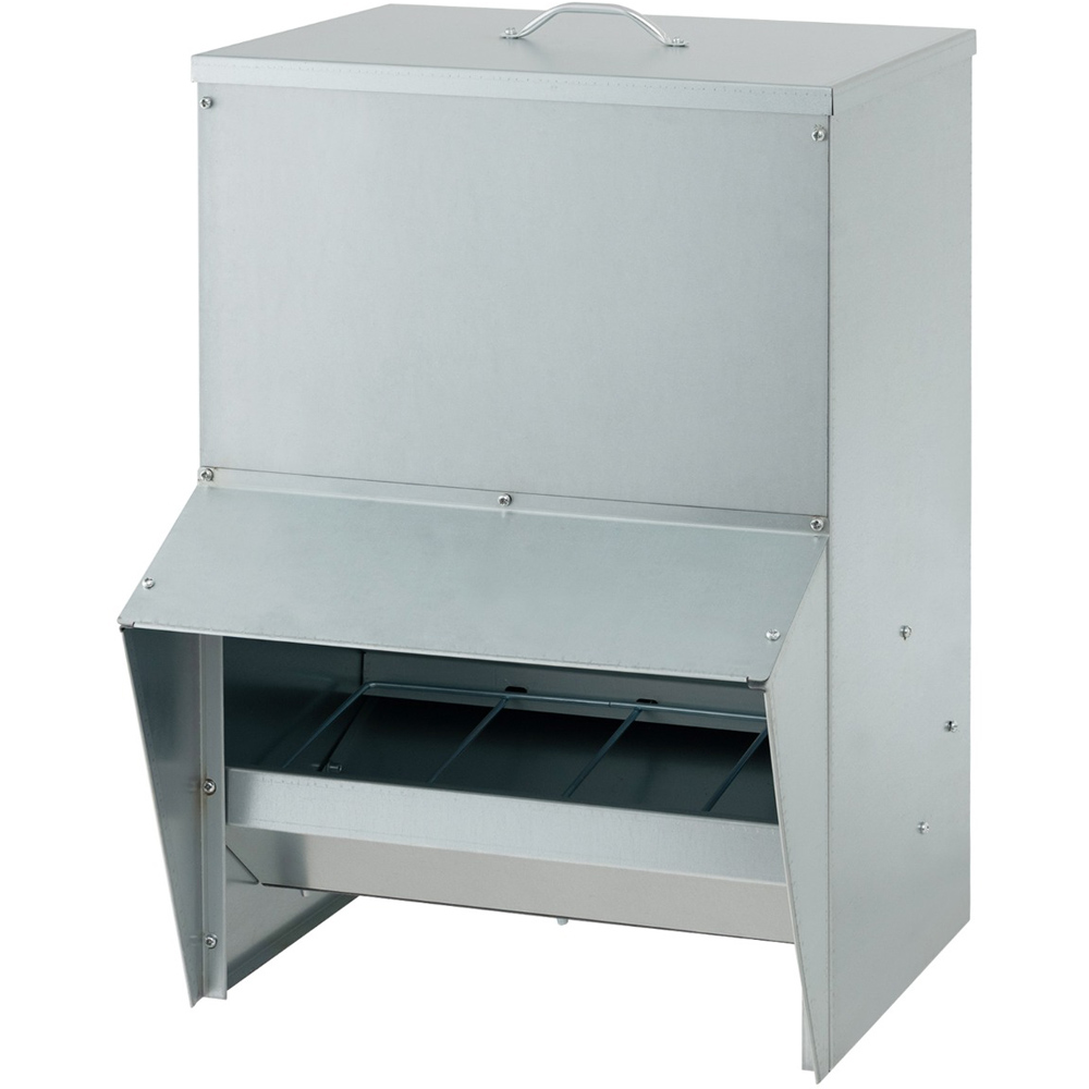 The high-capacity Costway Silver Wall Mount Galvanised Chicken Feeder is designed to hold 22kg of feed, significantly reducing the need for frequent refills. Plus, the openable lid with a handle is a thoughtful addition simplifying daily operations such as refilling and cleaning. The automatic feeder with a semi-enclosed trough will enhance efficiency by minimizing feed wastage. The awning will keep the food protected. Crafted from galvanised steel, the poultry feeder not only offers exceptional sturdiness but also boasts rust-resistant properties. Additionally, the no-waste automatic chicken feeder is equipped with two pre-drilled holes on the back, providing flexibility in how you choose to position it. Therefore, the outdoor metal feeding trough is well-suited for chickens, ducks, and geese. The chicken feeder boasts a large capacity of 22kg, allowing for extended periods between refills, making it an ideal choice for small backyard and larger agricultural operations. Moreover, the large capacity feeding dispenser can ease daily management chores. Crafted from galvanised metal, the automatic poultry feeder is resistant to rust, standing up against the elements when used in outdoor settings. Additionally, the high-strength material is solid and deformation-resistant for long-lasting use. Equipped with an easily accessible lid complete with a handle, the chicken feeding trough allows for effortless refills and routine cleanings. Moreover, by keeping the feeder covered with a lid, you can effectively prevent wild animals from accessing the feed. The large-capacity chicken feeder can significantly cut down feed spillage, thus maintaining a cleaner feeding environment. Complimenting the feature is a canopy shielding the feed from adverse weather conditions. The feeder comes with two pre-drilled holes positioned on the back panel, allowing you to secure the feeder in any location. Whether you would like to hang it on the wall or place it on the floor for easy access, the rodent-proof poultry feeder can meet your needs.