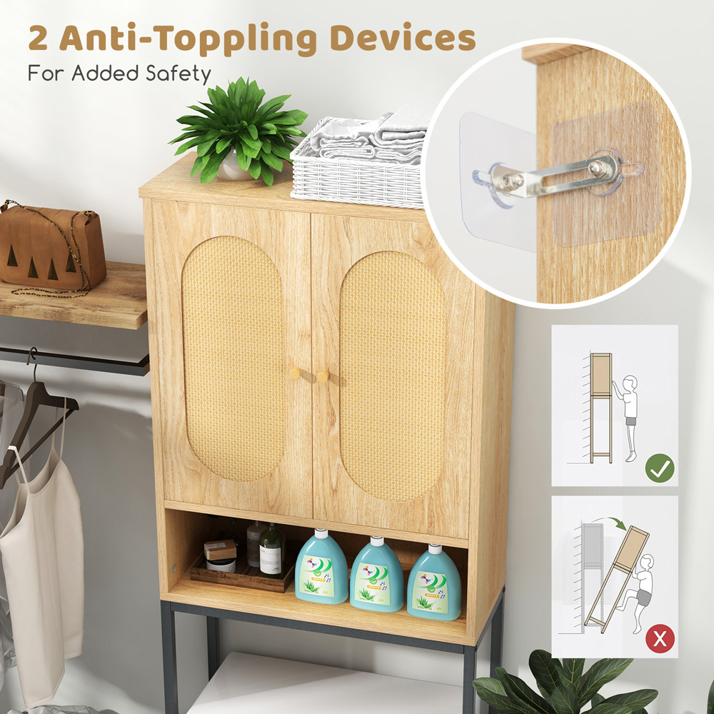 Maximize your bathroom's functionality and style with the Costway 2 Door Single Shelf Natural Over The Toilet Storage Cabinet. This storage cabinet features elegant woven rattan doors. This chic storage solution is perfect for organizing towels, toiletries, skincare products, and more with its wide cabinet top, five independent compartments, and a large semi-open shelf. Crafted from high-quality MDF and premium metal pipes, the cabinet is built to last while the anti-tipping devices ensure safety for both children and pets. The soft-close hinges and durable metal knobs enhance the user experience, making this cabinet a must-have for any modern home.