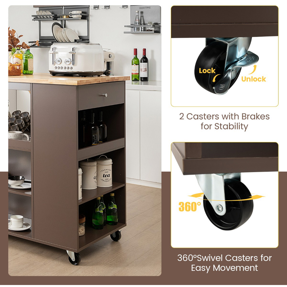 Elevate your kitchen's functionality with the Mobile Serving Trolley Cart, featuring a robust rubber wood top and a versatile brown finish. This trolley not only offers a sturdy surface for food prep but also includes a handy drawer, adjustable shelves, and smooth-rolling lockable casters for effortless mobility. Whether you're looking for extra space for your kitchen supplies or a mobile solution for serving, this trolley cart is designed to meet various needs with its spacious and customizable storage options. It's more than just a kitchen accessory; it's a movable hub for your culinary adventures.