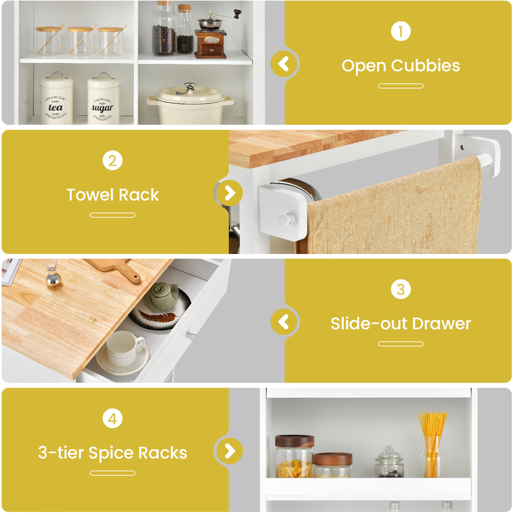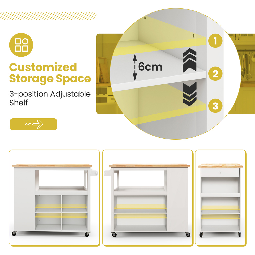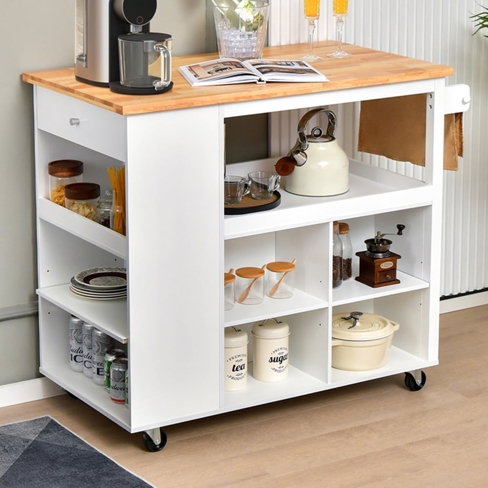 Elevate your kitchen's functionality with the Mobile Serving Trolley Cart, featuring a robust rubber wood top and a versatile white finish. This trolley not only offers a sturdy surface for food prep but also includes a handy drawer, adjustable shelves, and smooth-rolling lockable casters for effortless mobility. Whether you're looking for extra space for your kitchen supplies or a mobile solution for serving, this trolley cart is designed to meet various needs with its spacious and customizable storage options. It's more than just a kitchen accessory; it's a movable hub for your culinary adventures.