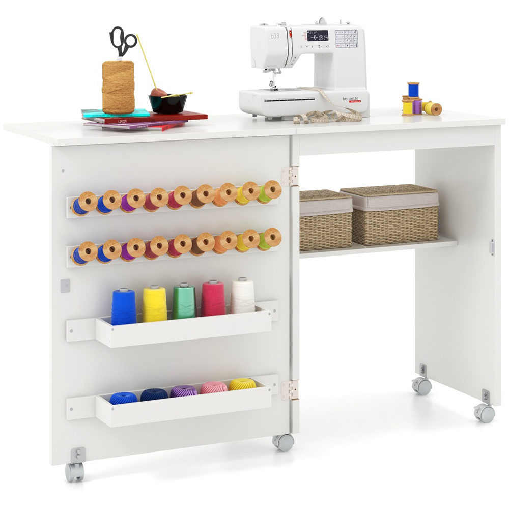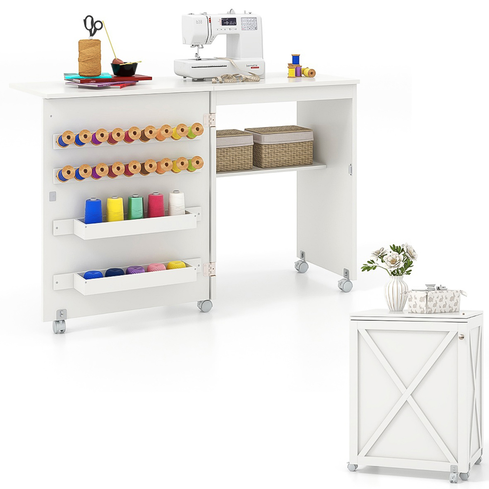 Experience the versatility and charm of this folding sewing table, expertly designed to meet the needs of any compact space. Whether you're crafting, working, or simply need an extra surface, this table effortlessly transitions into a side table or computer desk. Its spacious storage options, including a generous tabletop, two trays, 18 pegs, and an open compartment, ensure all your essentials are organised and within easy reach. The smooth mobility provided by five lockable swivel wheels allows you to relocate and secure your workspace effortlessly. Enhanced with a rustic barn door design, this sewing table not only offers functionality but also adds a stylish touch to your home decor.
